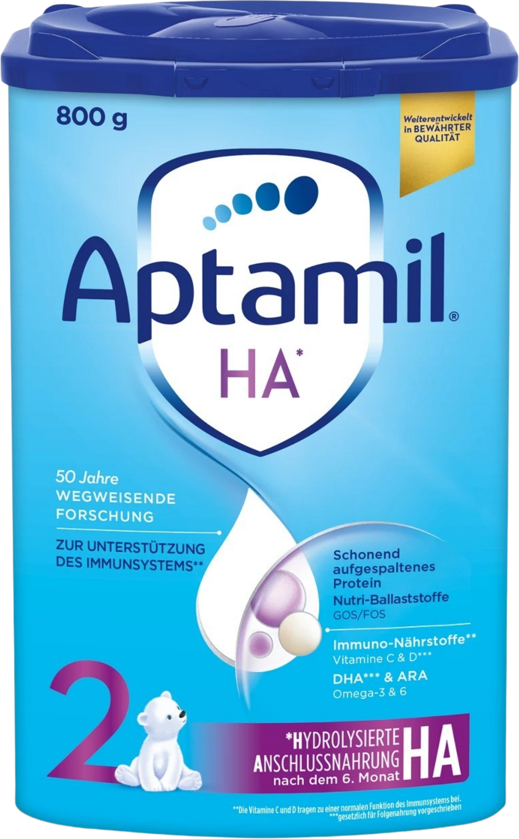 - Aptamil HA 2 kann ab dem 7. Monat als Bestandteil einer gemischten Ernährung gegeben werden und sollte nicht in den ersten 6 Monaten als Muttermilchersatz verwendet werden.