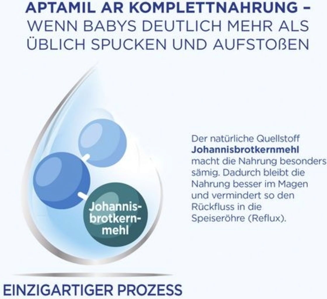 Aptamil ANTI-REFLUX wurde als Komplettnahrung für Babys entwickelt, die unter Refluxbeschwerden leiden. Das bedeutet, dass sie nach dem Essen nicht nur gelegentlich oder nur kleine Mengen Nahrung aufstoßen, sondern besonders häufig oder schwallartig spucken. Durch die spezielle Rezeptur mit dem natürlichen Quellstoff Johannisbrotkernmehl wird die Nahrung angedickt und rinnt nicht mehr so leicht in die Speiseröhre zurück.