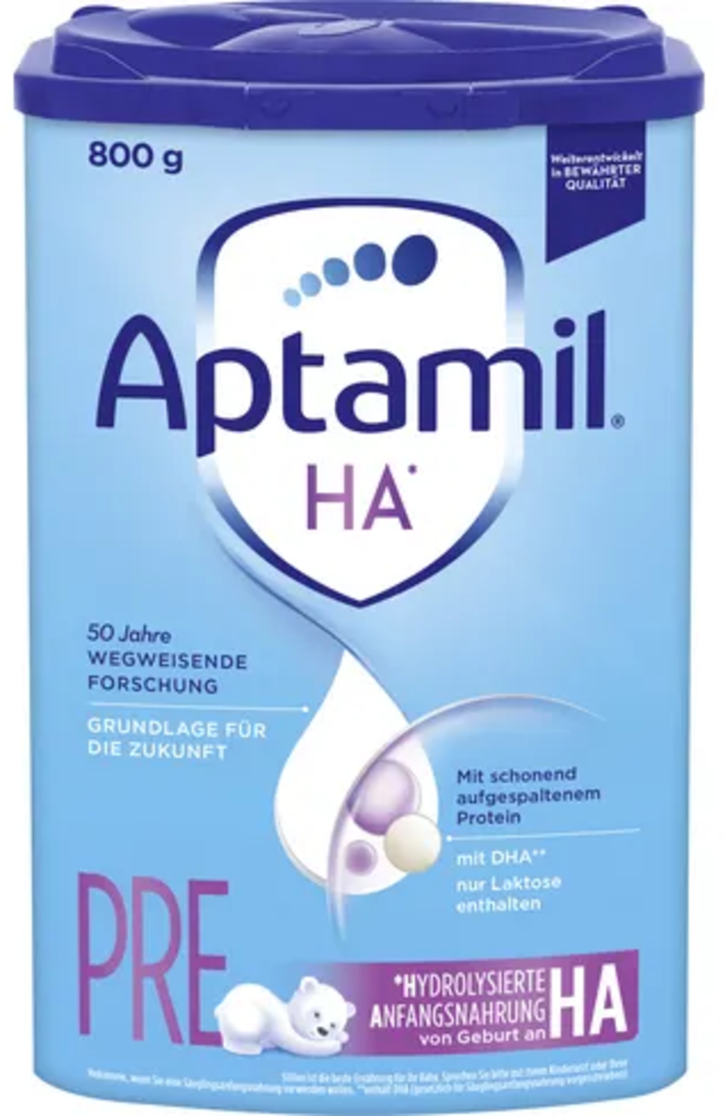 In Familien mit erhöhter Neigung zu Allergien, ist es besonders empfohlen, Babys in den ersten sechs Lebensmonaten ausschließlich mit Muttermilch zu füttern. Ist dies nicht möglich und wird nach ärztlicher Absprache oder Beratung bei einer Hebamme entschieden, dass voll oder teilweise auf Anfangsnahrung im Fläschchen umgestellt wird, ist die Säuglingsanfangsnahrung auf Kuhmilchbasis HA PRE von Aptamil eine geeignete Alternative bei familiär bedingter Allergieneigung. Die Rezeptur enthält eine spezielle Kombination aus schonend aufgespaltenem (hydrolysiertem) Protein.