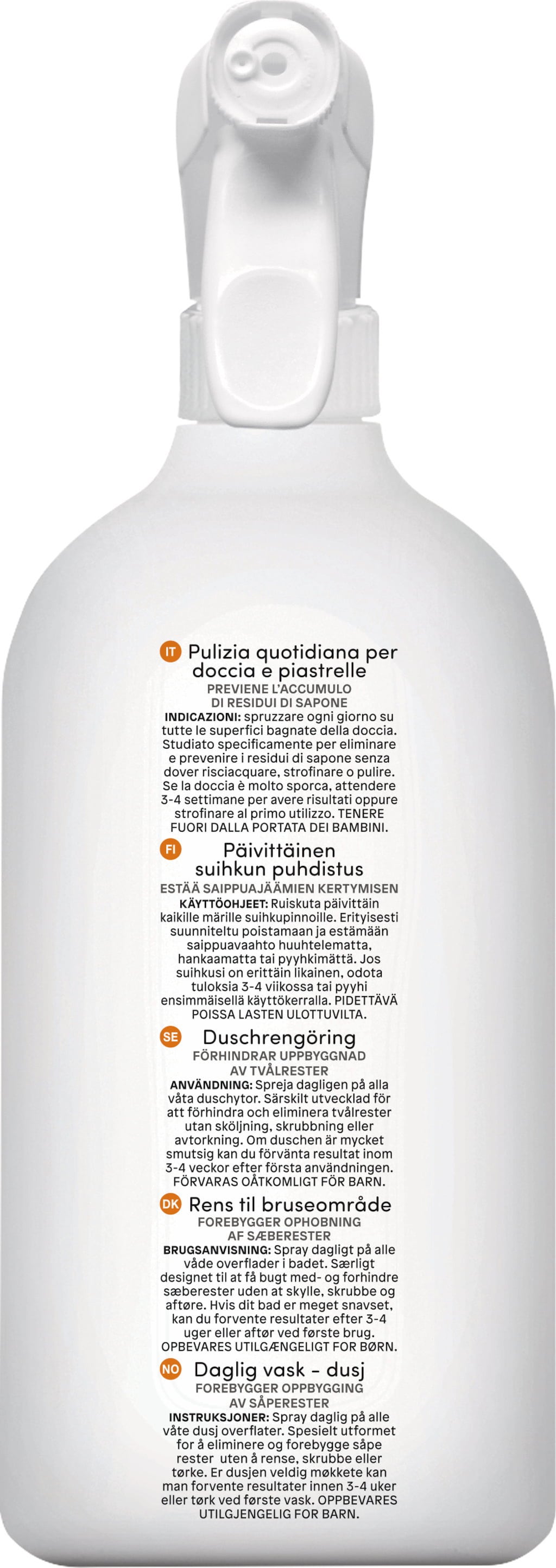 Täglich auf die feuchten Oberflächen von Dusche und Bad aufsprühen. Speziell zur Beseitigung und Vorbeugung von Seifenrückständen konzipiert, ohne anschließendes abspülen, reiben oder wischen.