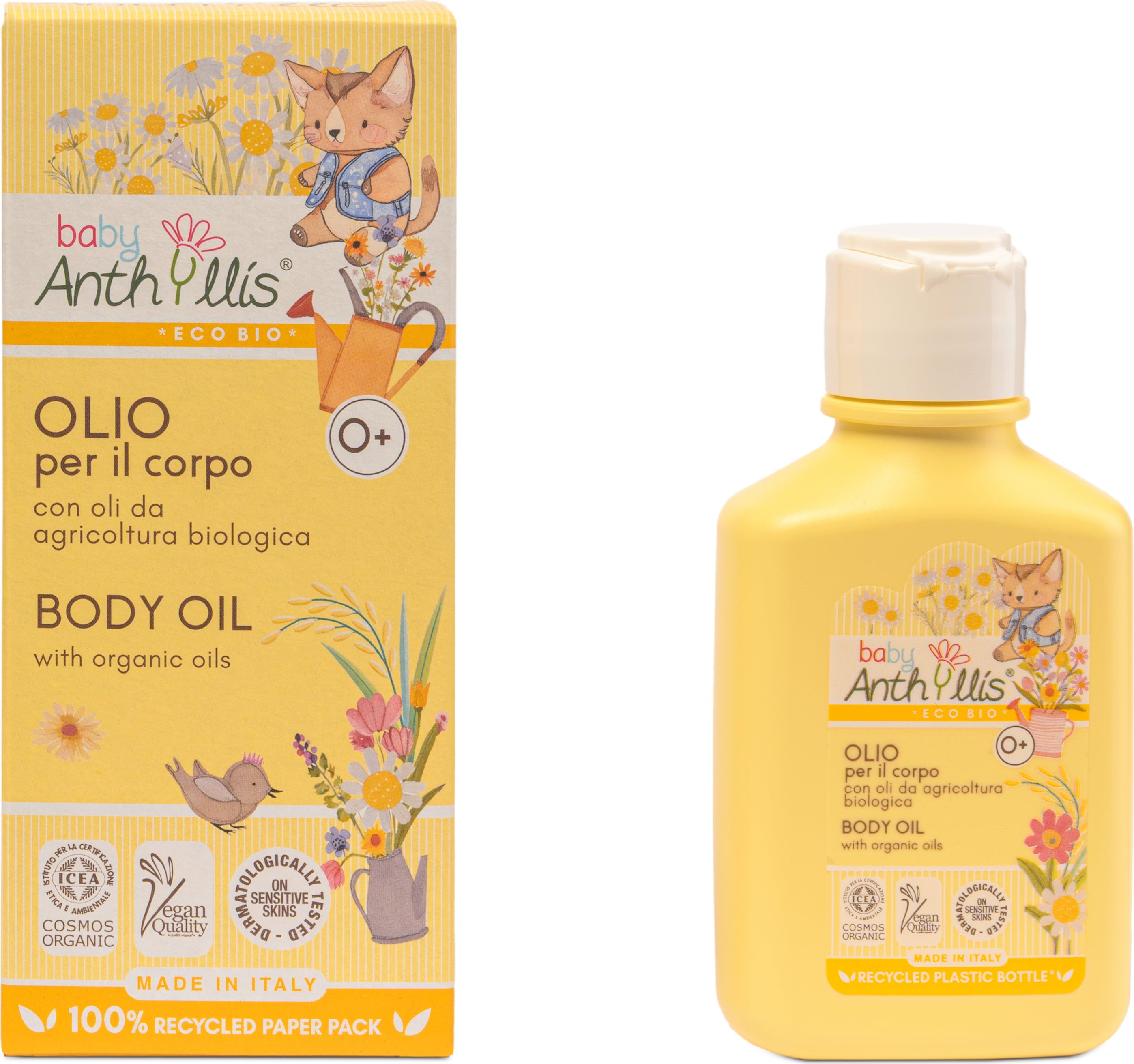Dieses Körperöl von Baby Anthyllis spendet sensibler, trockener Babyhaut wertvolle Feuchtigkeit und reichhaltige Pflege. Die zu 100 % natürliche und vegane Formulierung enthält hochwertiges Soja-, Sonnenblumen- und Mandelöl aus biologischem Anbau und besitzt daher nährende, feuchtigkeitsspendende Eigenschaften. Das Körperöl hinterlässt herrlich gepflegte und wunderbar weiche Haut!