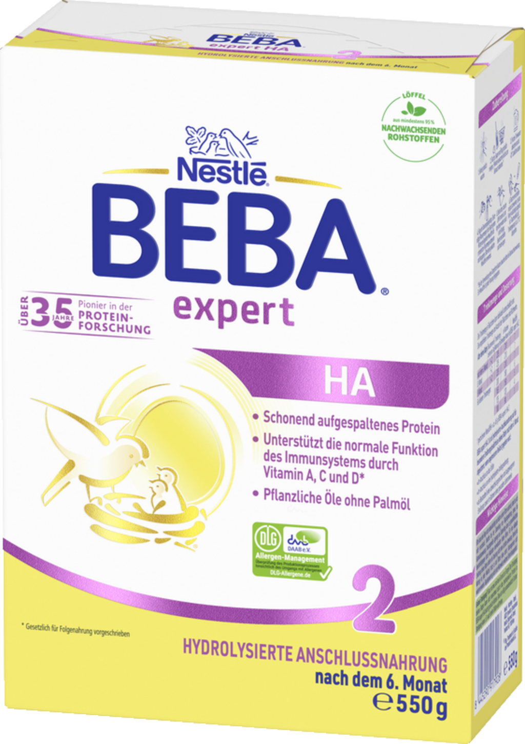 Die BEBA expert HA 2 ist eine hydrolysierte Folgenahrung, die speziell auf die besonderen Ernährungsbedürfnisse von Babys ab dem 7. Monat abgestimmt ist – in Kombination mit einer geeigneten Beikost. Sie enthält aufgespaltenes (hydrolysiertes) Eiweiß und eignet sich ideal im Anschluss an das Stillen oder an eine hydrolysierte Anfangsnahrung.