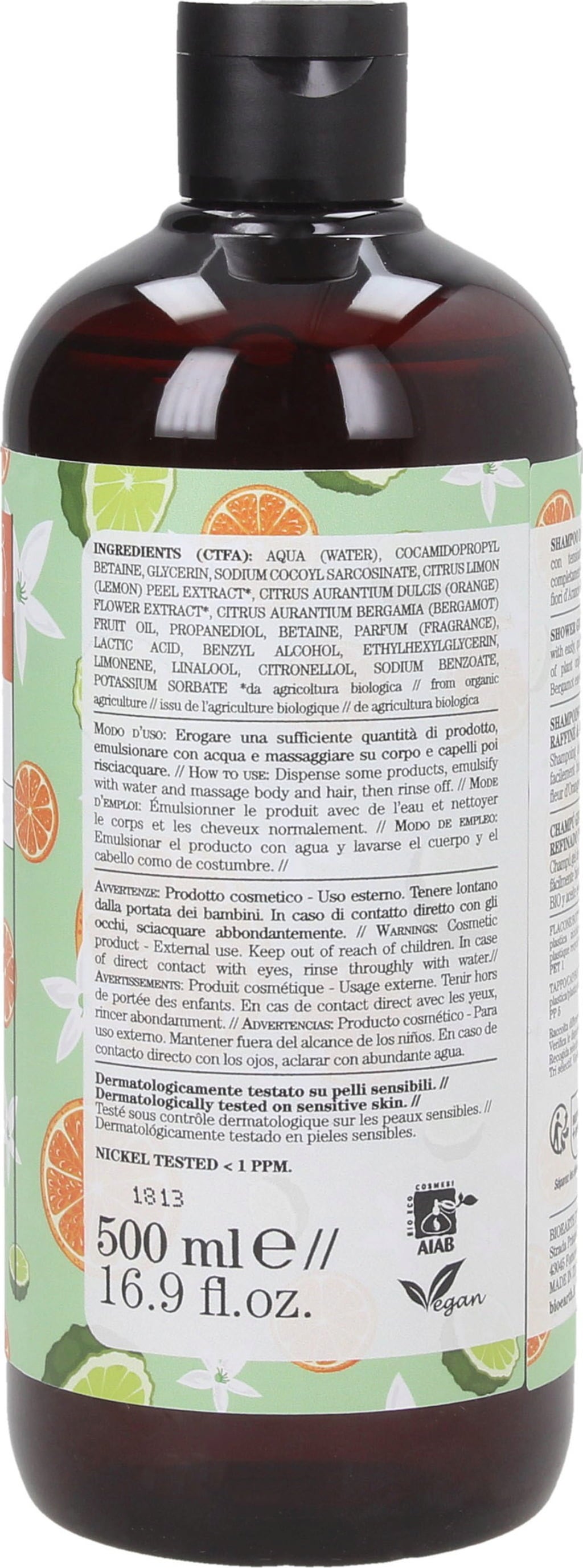 Aqua, Cocamidopropyl Betaine, Glycerin, Sodium Cocoyl Sarcosinate, Citrus Limon (Lemon) Peel Extract[1], Citrus Aurantium Dulcis (Orange) Flower Extract[1], Citrus Bergamia Fruit Oil, Propandiol, Betaine, Parfum (Fragrance), Lactic Acid, Benzyl Alcohol, Ethylhexylglycerin, Limonene, Linalool, Citronellal, Sodium Benzoate, Potassium Sorbate