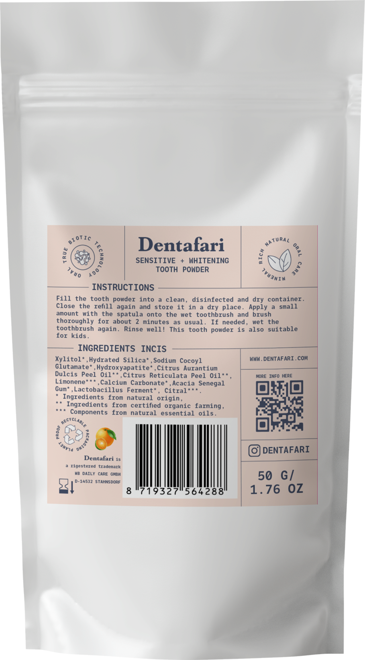 Das Zahnpulver von Dentafari reinigt die Zähne und das Zahnfleisch dank der wertvollen und effektiven Inhaltsstoffe, auf eine sanfte aber gründliche Art und Weise. Der fruchtige Geschmack nach Orangen und Mandarinen macht jedes Zähneputzen zu einem tollen Erlebnis. Das innovative Alternativprodukt ist vegan und plastikfrei verpackt.