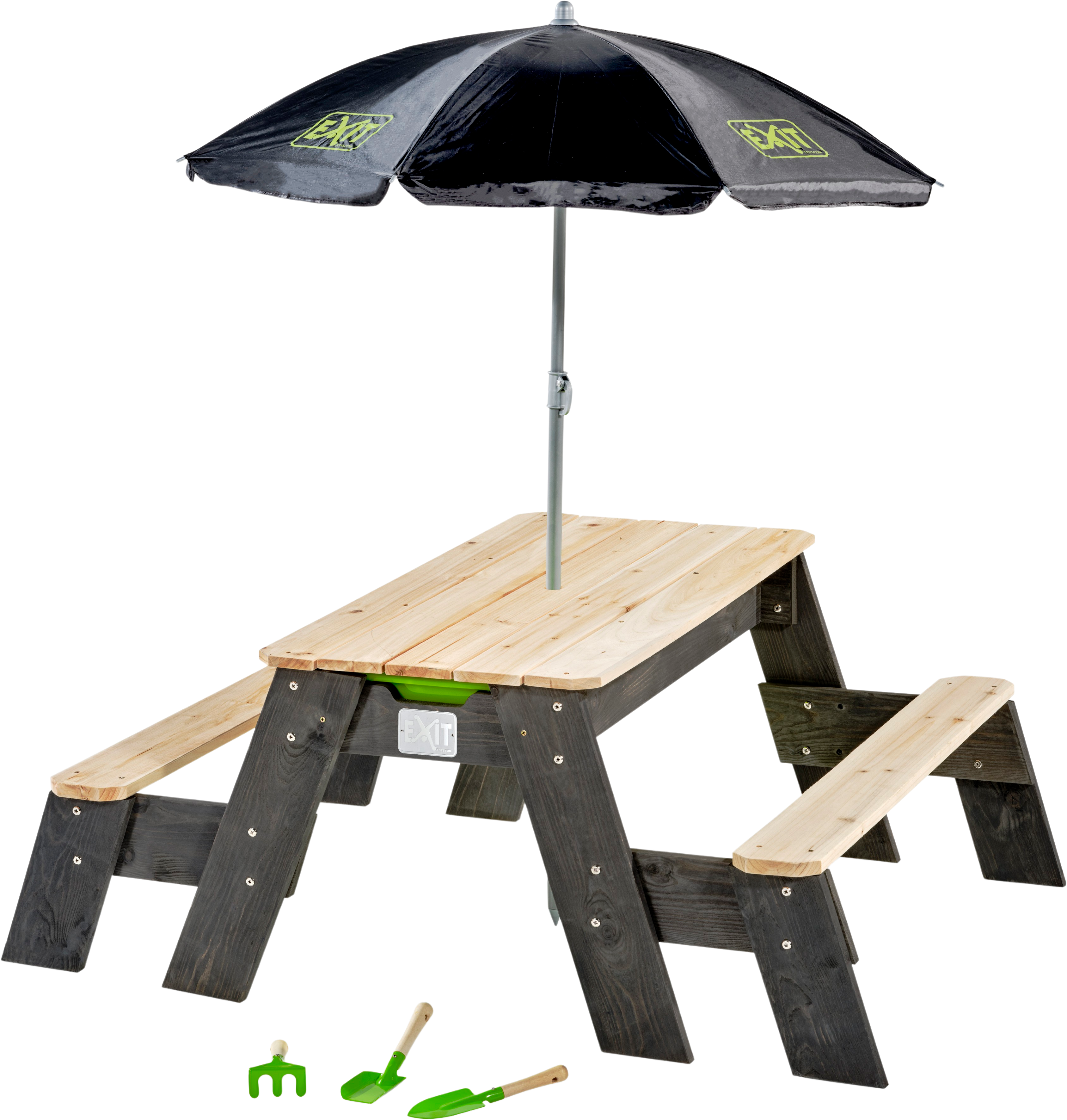 Exit Toys Aksent Sand-, Wasser- & Picknicktisch (2 Bänke) mit Schirm & Gartenwerkzeugen