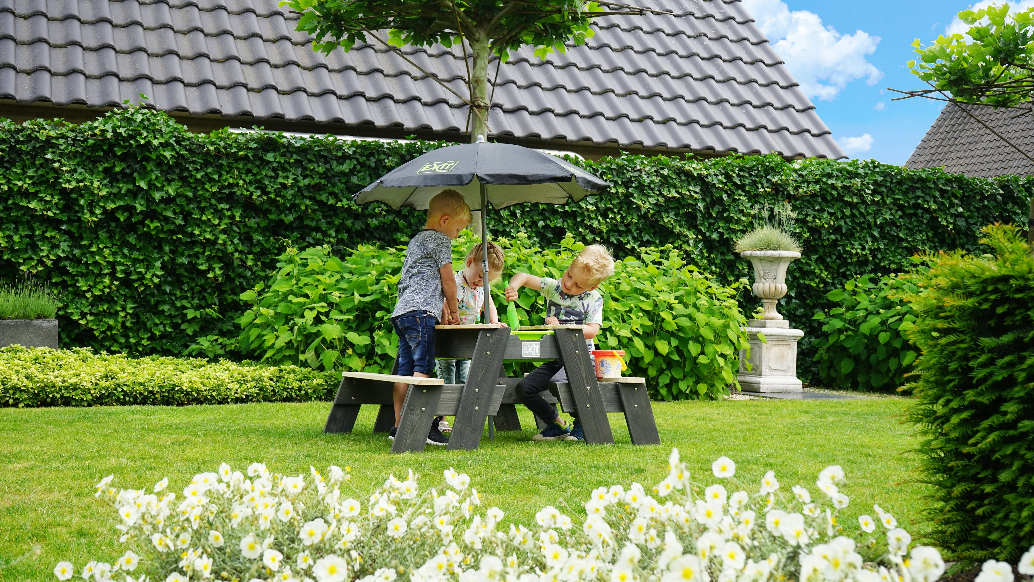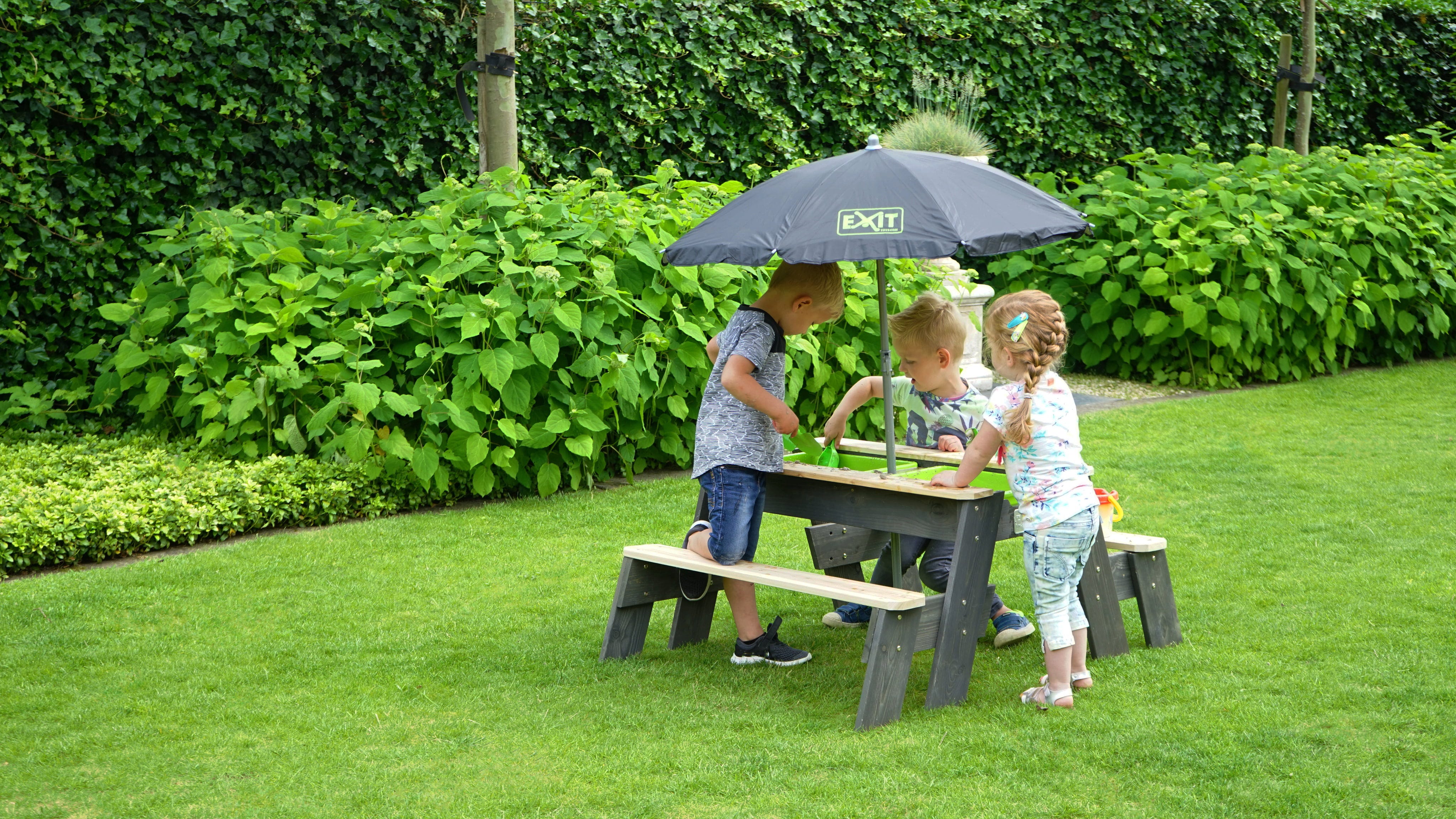 Der Aksent Sand-, Wasser- & Picknicktisch von Exit Toys bildet einen echten Allrounder für sommerlichen Gartenspaß!