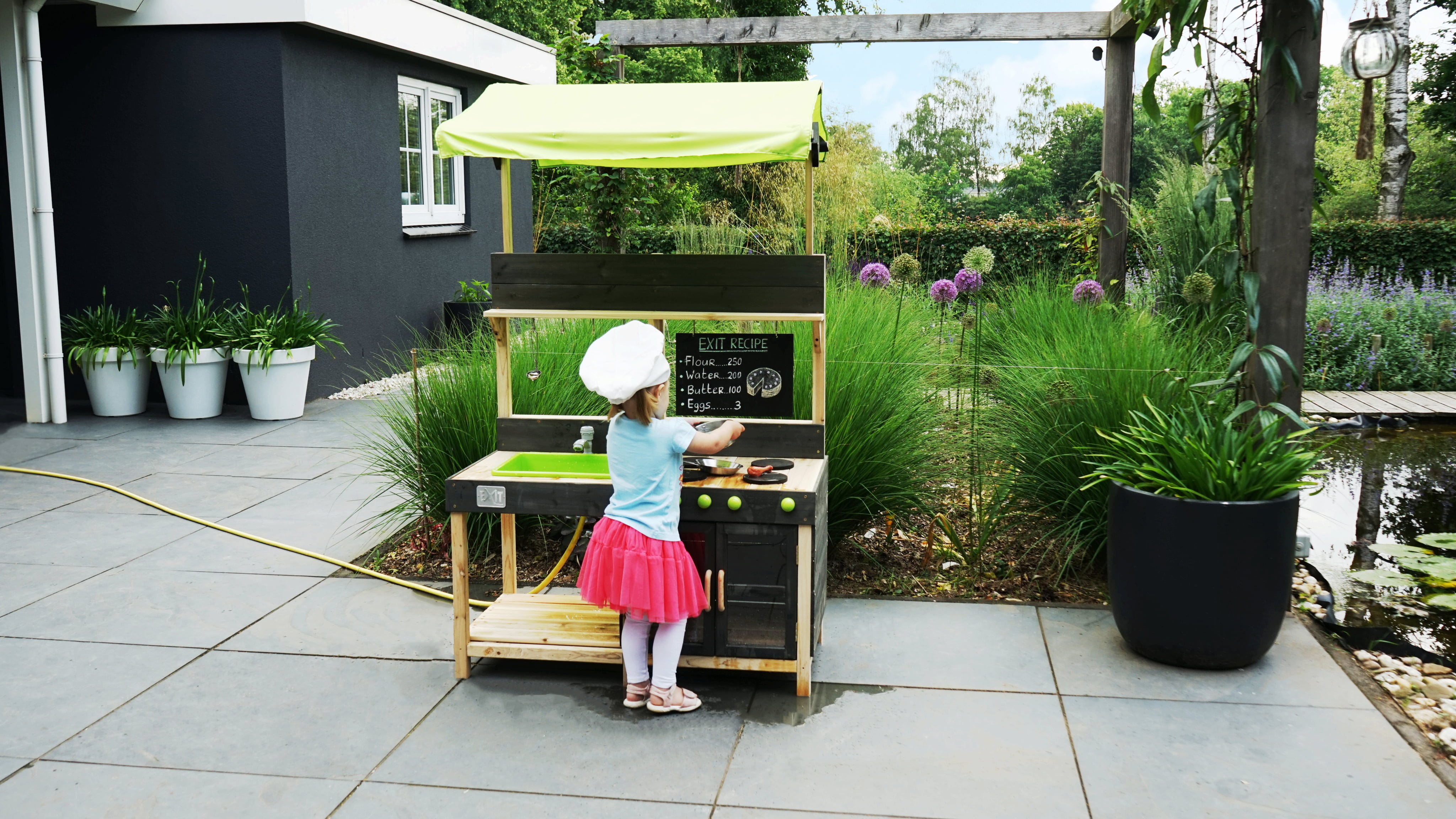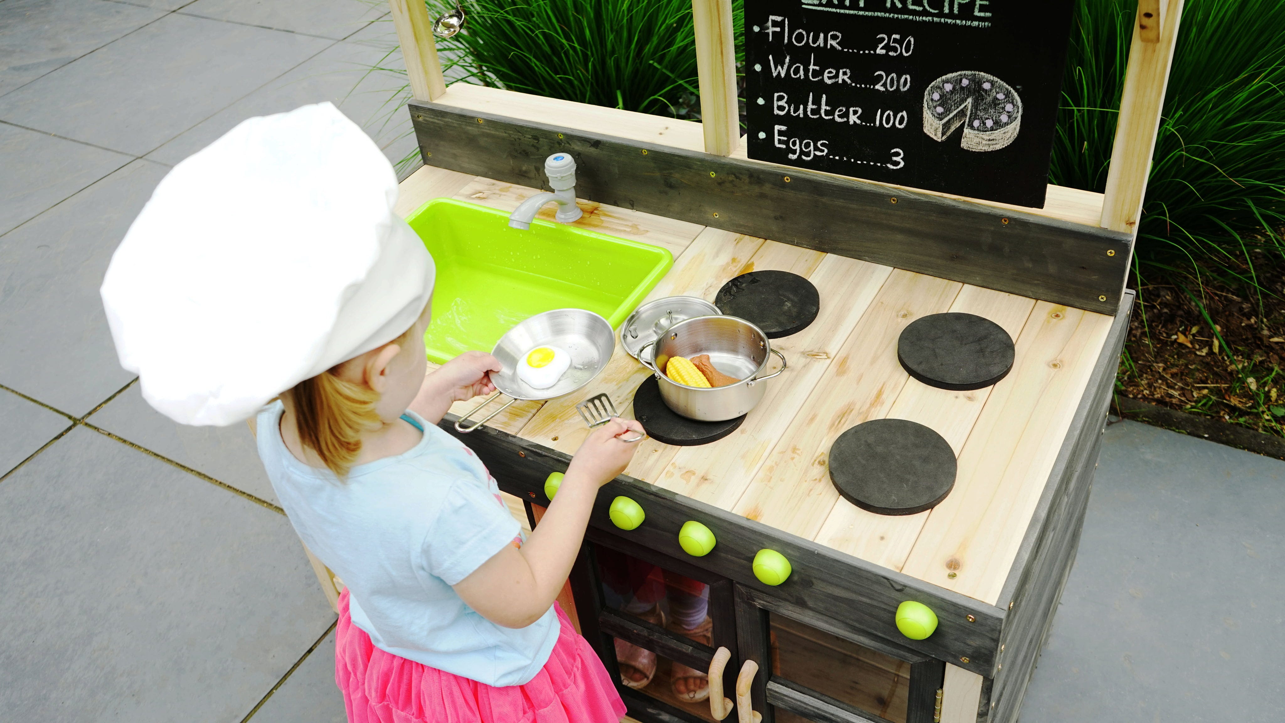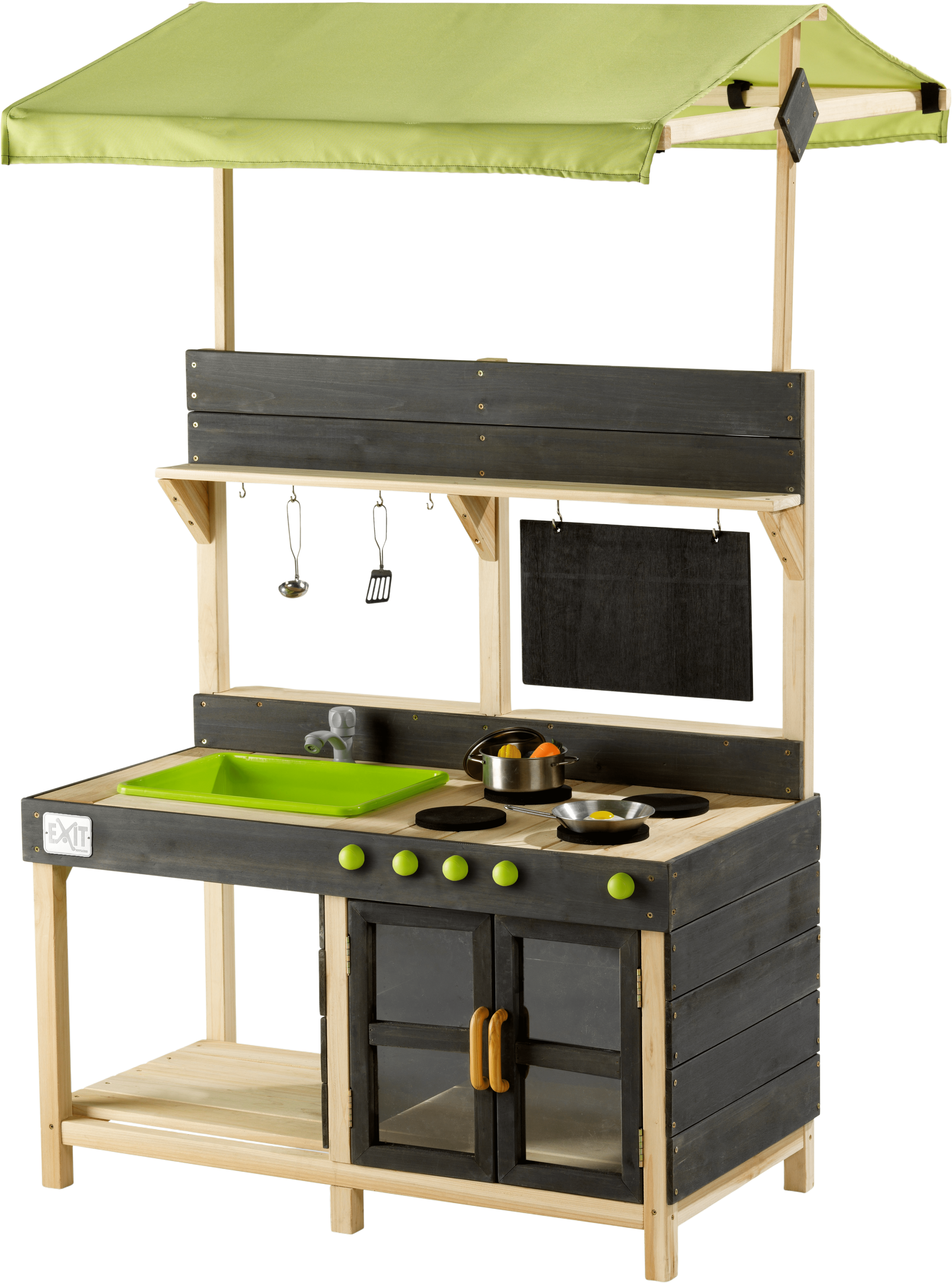 Die Spielküche überzeugt durch ihre vielen realistischen Details: Ein Herd mit Drehknöpfen, ein Backofen für leckere Sandkuchen und natürlich ein funktionierender Wasserhahn, der mit einem Gartenschlauch verbunden werden kann - dank des herausnehmbaren Behälters lässt sich das "Waschbecken" danach schnell wieder ausleeren. Die kleine Kreidetafel und das grüne Dach verleihen der Küche auch das Flair eines Marktstandes, sodass die Kinder ihre selbstgekochten Gerichte auch gleich verkaufen können.