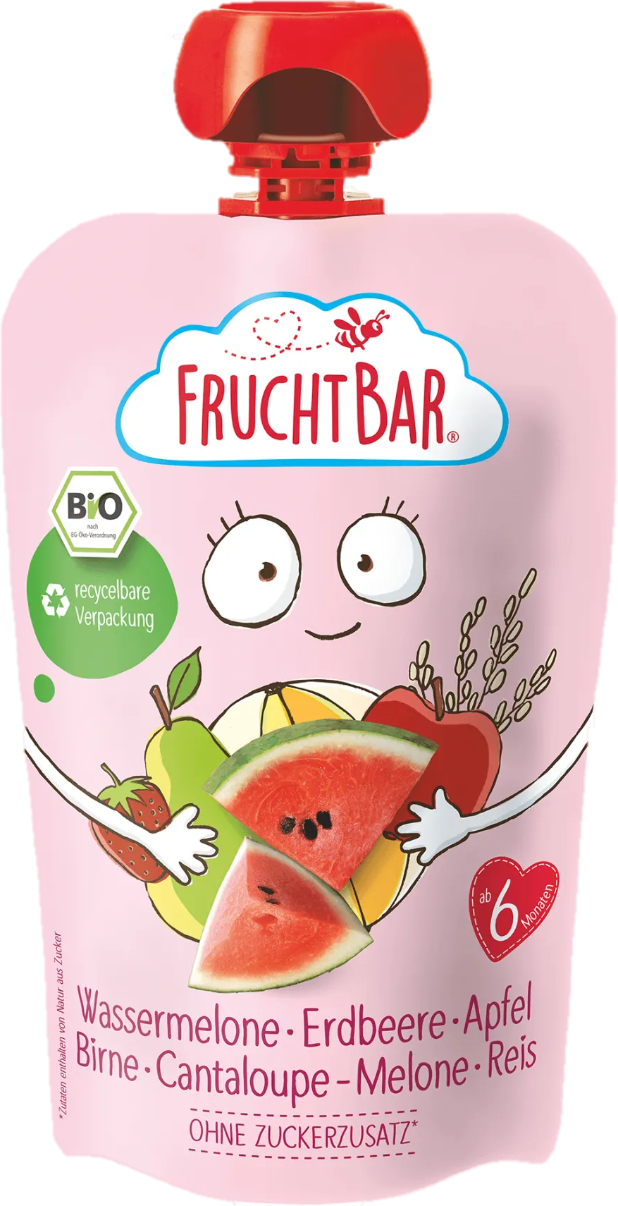 FruchtBar Bio Quetschie Wassermelone-Erdbeere-Apfel-Birne-Cantaloupe Melone-Reis, 100 g