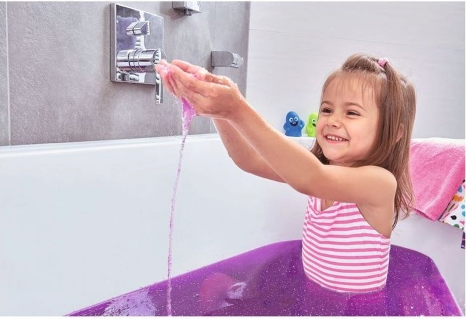 Da werden die Kinder aber Augen machen! Ein Säckchen mit dem Einhorn Glitzerbad verwandelt das Wasser in der Wanne in lilafarbenen Glitzerschleim. So steigt der Spaßfaktor beim Baden ins Unermessliche. Der Schleim ist selbstverständlich dermatologisch getestet und biologisch abbaubar. Ist das Vergnügen vorbei, wird der Schleim einfach mit genügend Wasser verdünnt. Danach kann er bedenkenlos abgelassen werden.