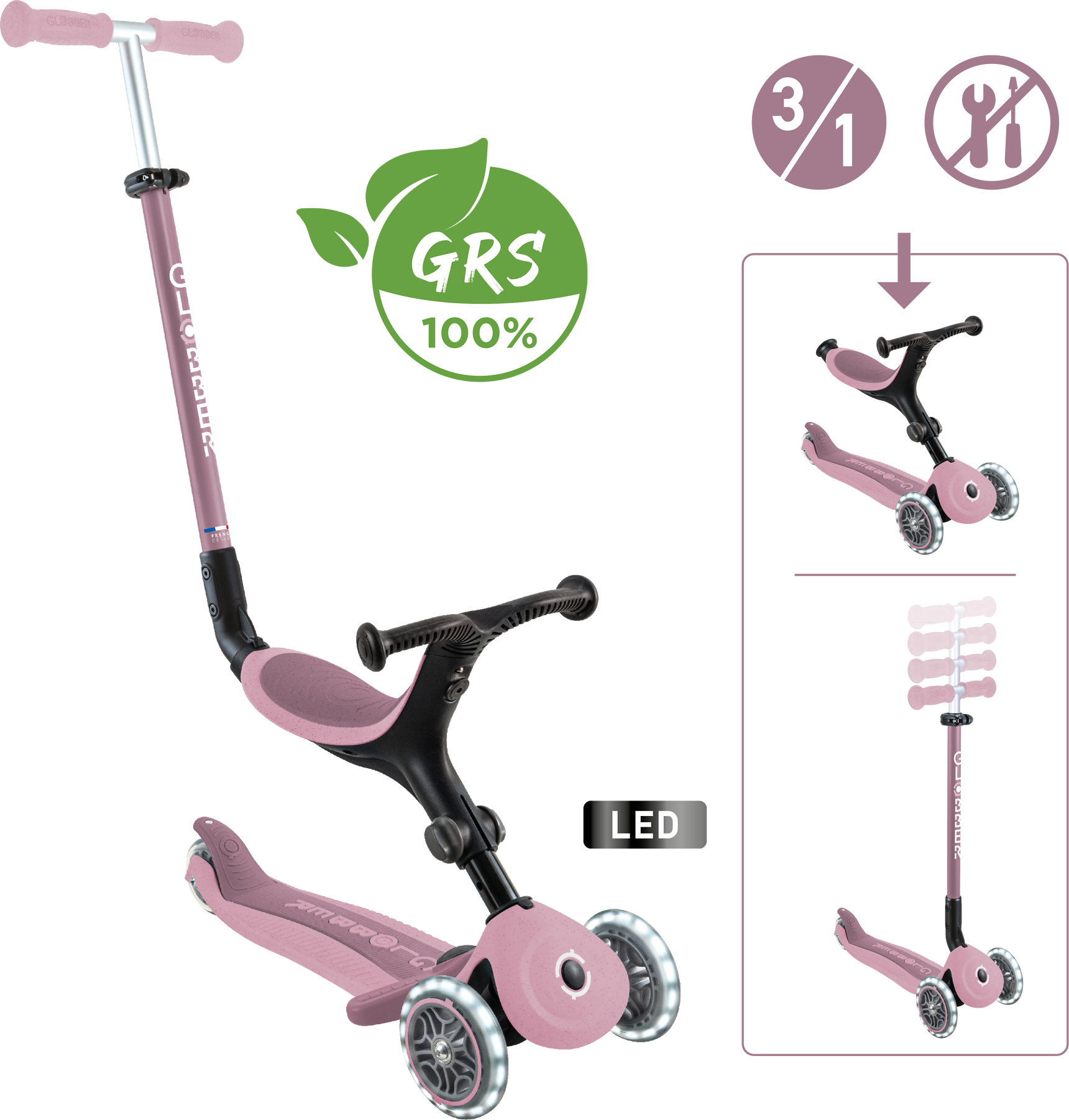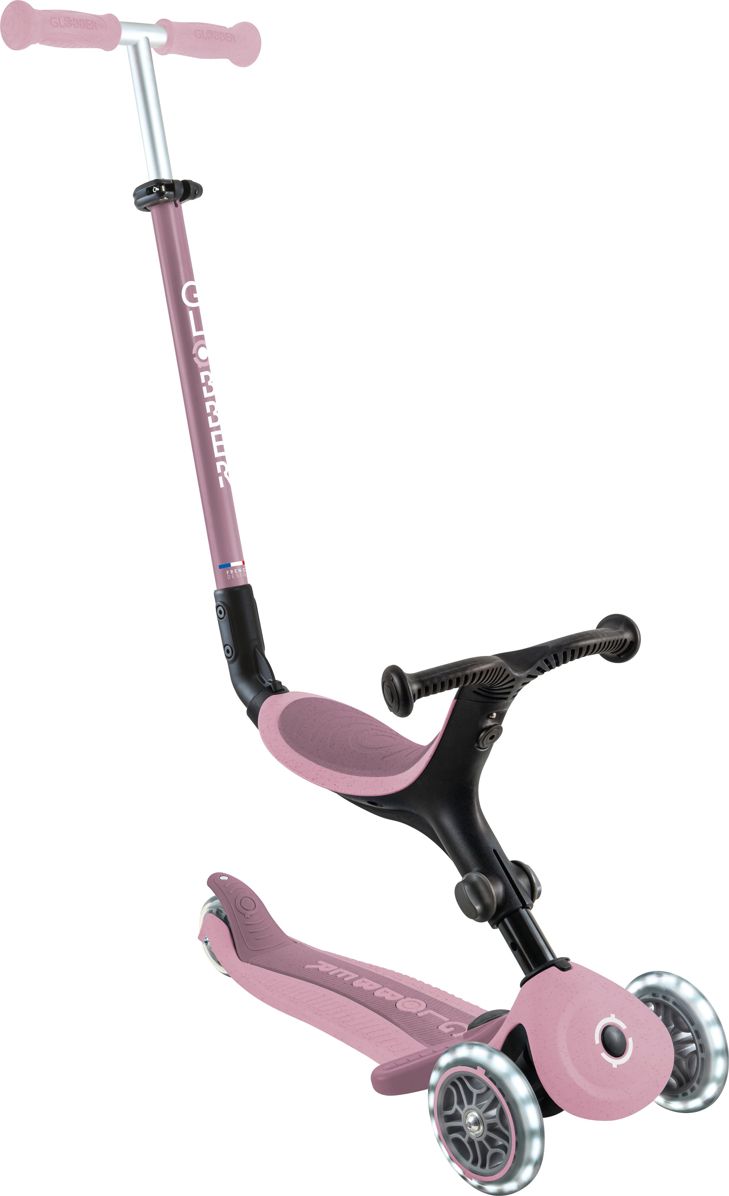Der Go-Up Active Lights Eco vereint Umweltfreundlichkeit mit Funktionalität. Eltern erhalten ein langlebiges 3-in-1-Modell, das vom Sitzroller zum Scooter wächst – ideal für viele Jahre.