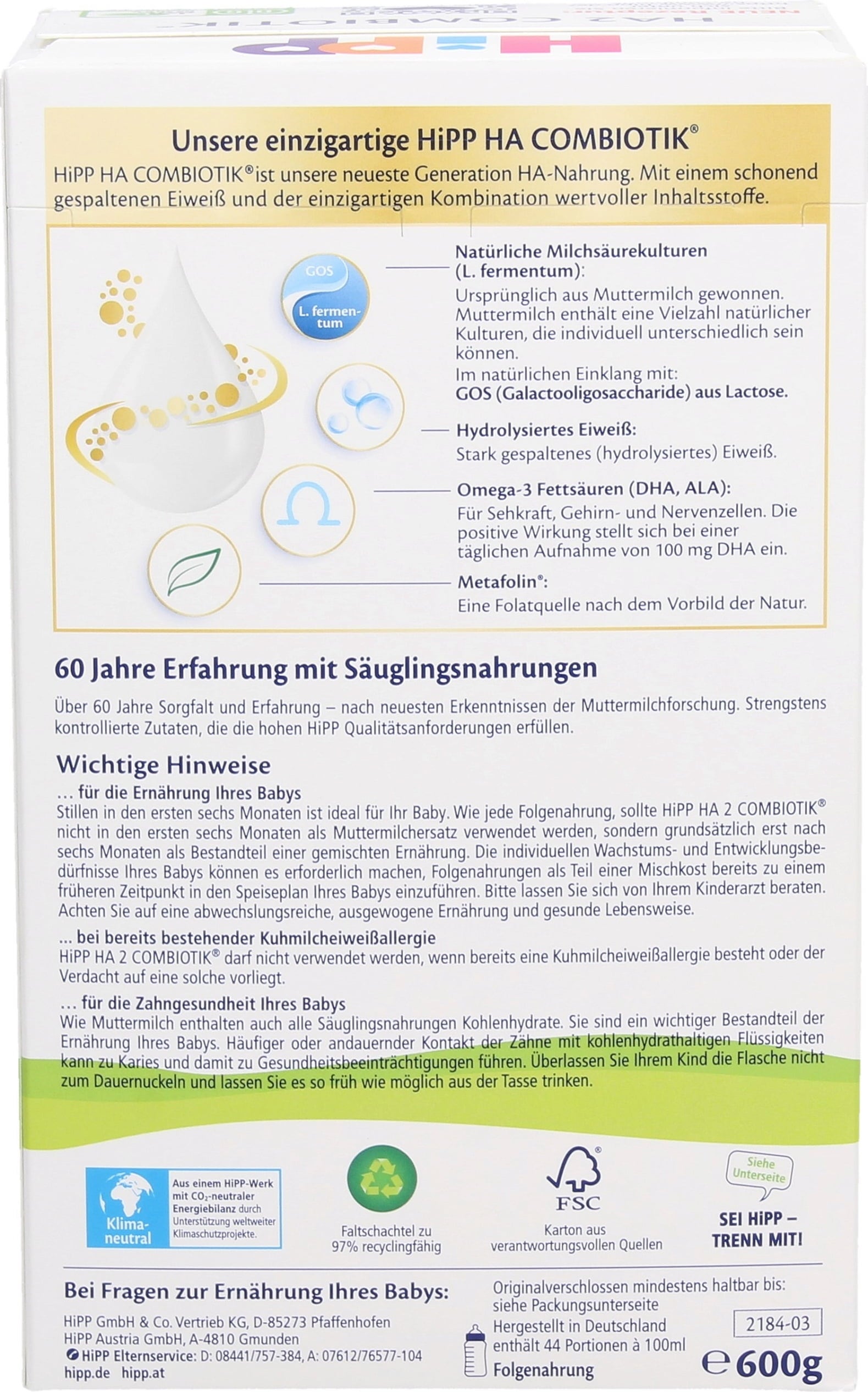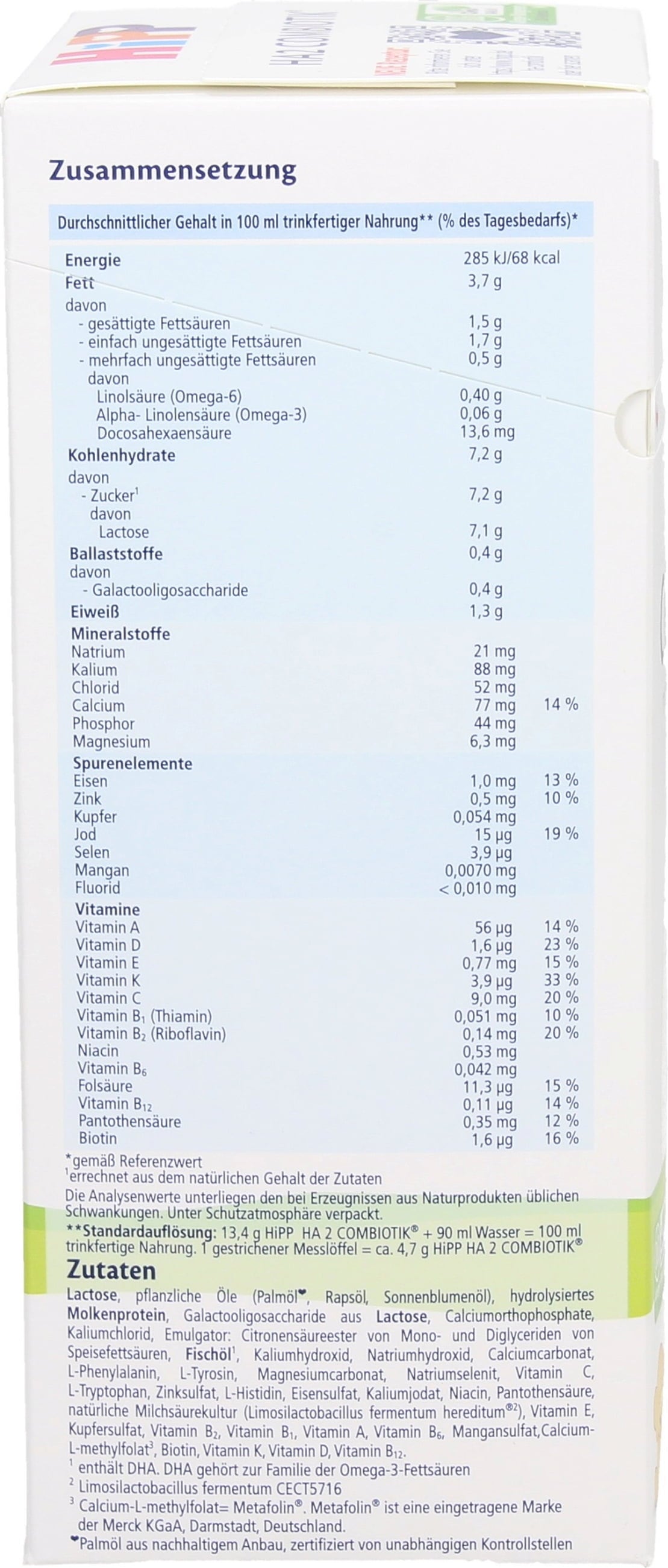 - HiPP Folgemilch HA Combiotik® HA 2 ist nicht für Babys mit diagnostizierter Kuhmilcheiweißallergie geeignet bzw. wenn der Verdacht auf eine solche Allergie besteht.