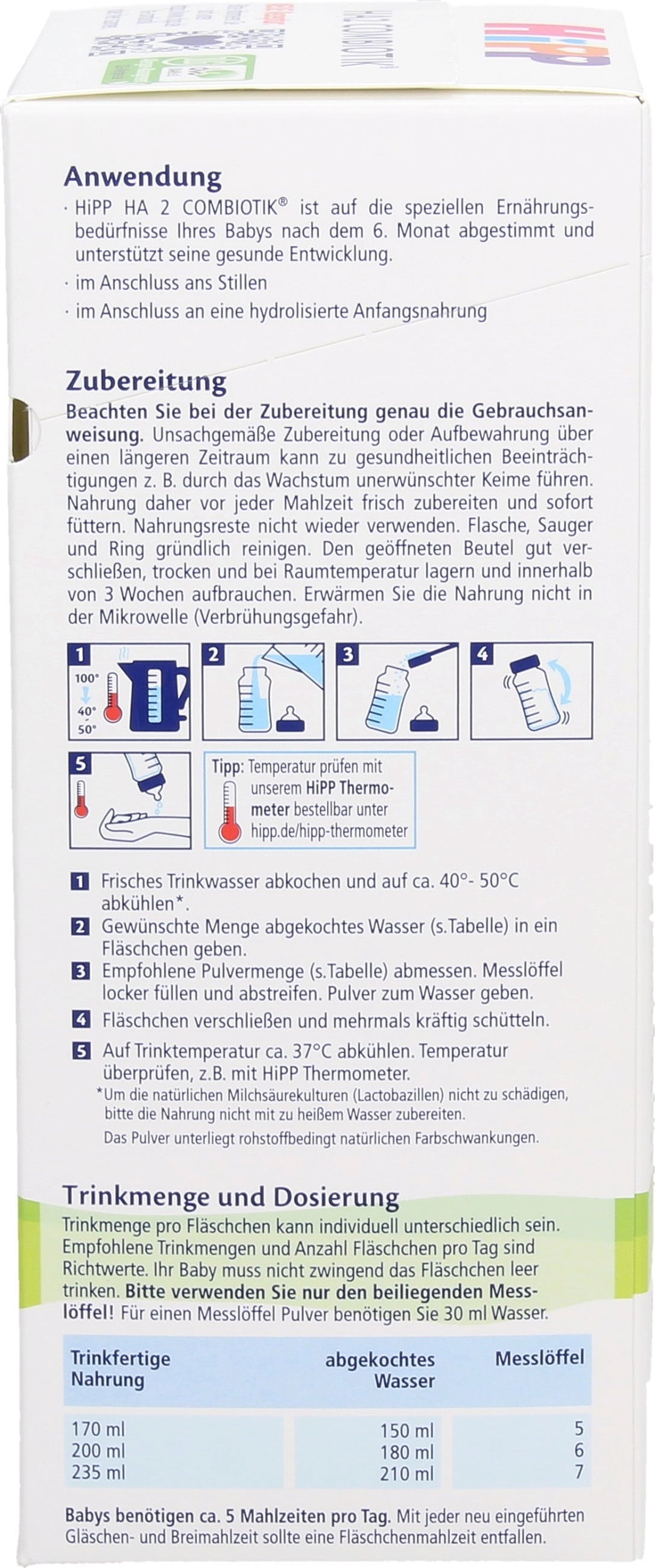 - 13,4 g HiPP HA 2 COMBIOTIK ® + 90 ml Wasser = 100 ml trinkfertige Nahrung