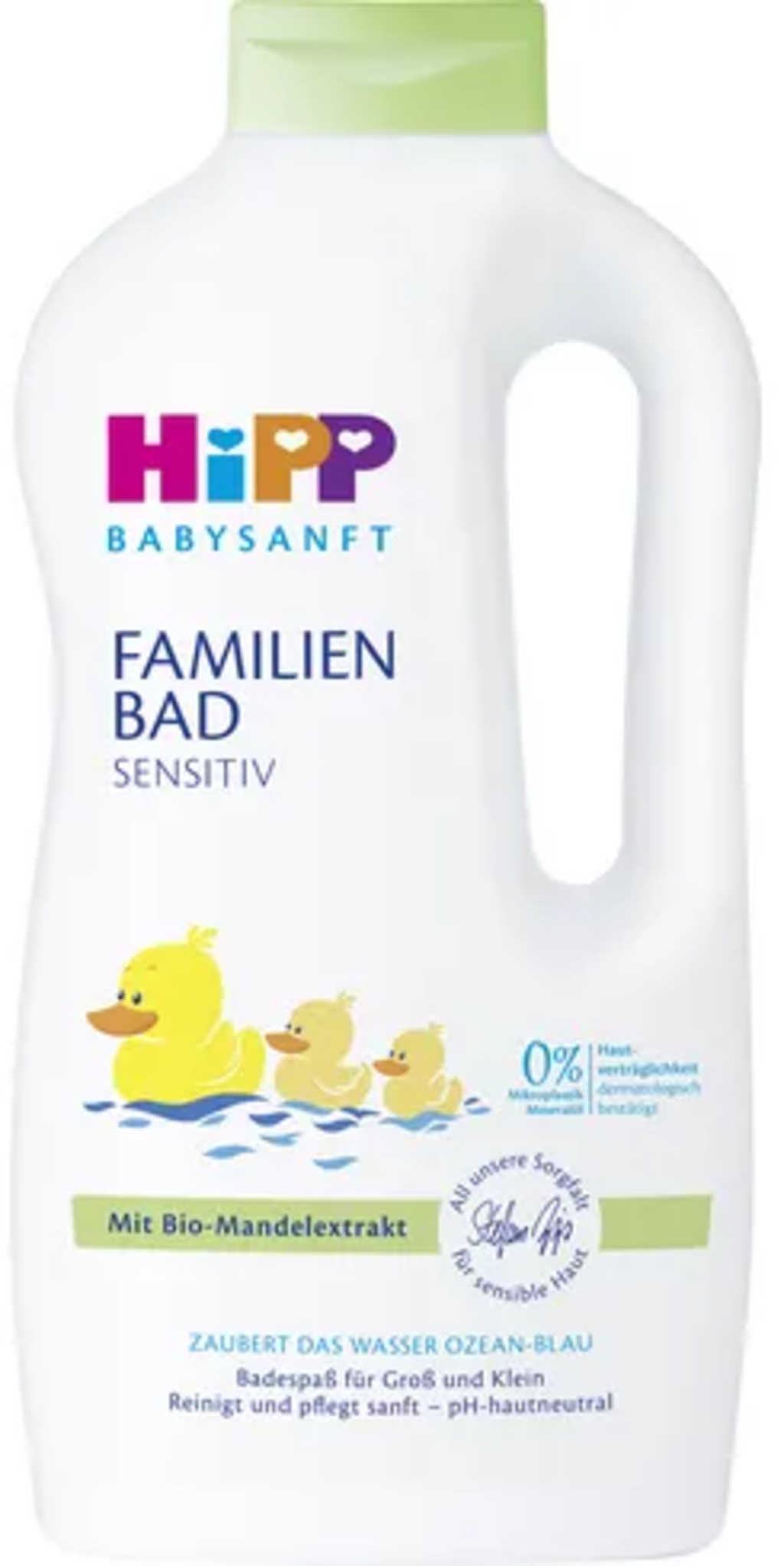 Mit dem Babysanft Familienbad Sensitiv von HiPP ist der Badespaß vorprogrammiert. Das Familienbad färbt das Wasser ozean-blau. Haut, Haare und Wanne nehmen dabei natürlich keine Farbe auf. Bio-Mandelextrakt pflegt dafür ganz sanft eure Haut. Verwenden könnt ihr das Familienbad bereits ab dem 1. Lebenstag deines Babys.
