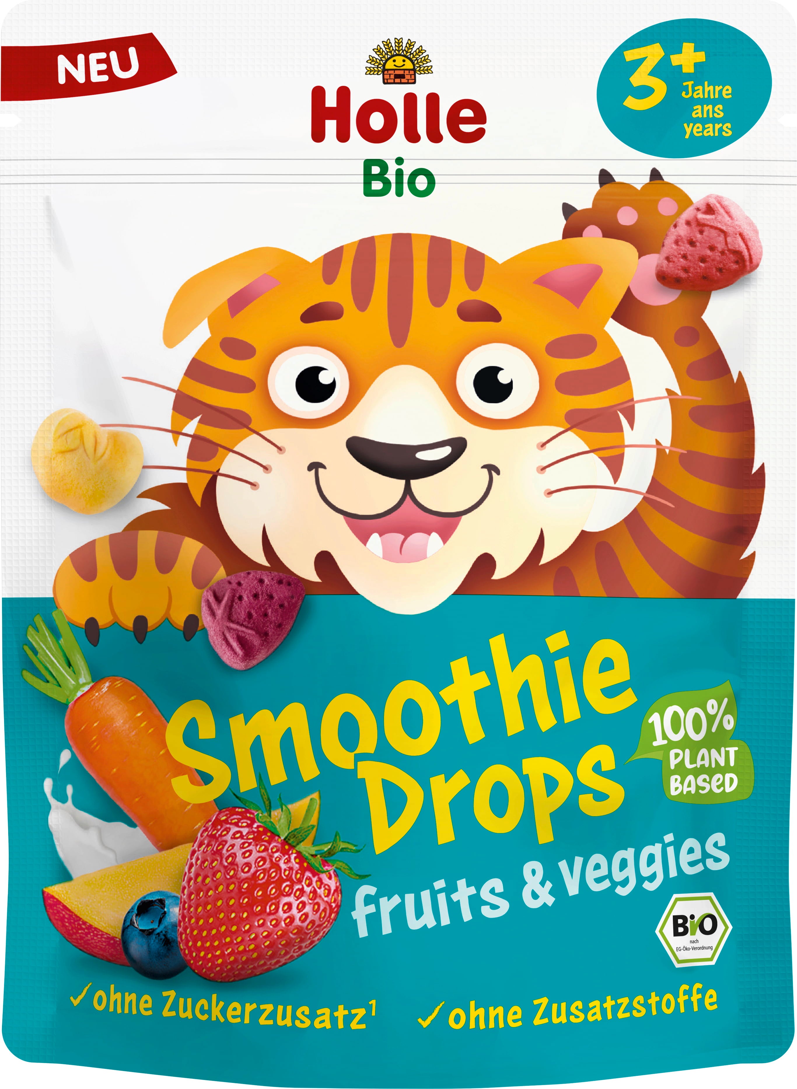Dieser leckere, vegane Snack von Holle besteht aus frischen Früchten, Gemüse und köstlicher Kokosmilch! So entstehen aus Mangos, Bananen, Äpfel, Karotten und vielem mehr leckere Smoothie Drops.