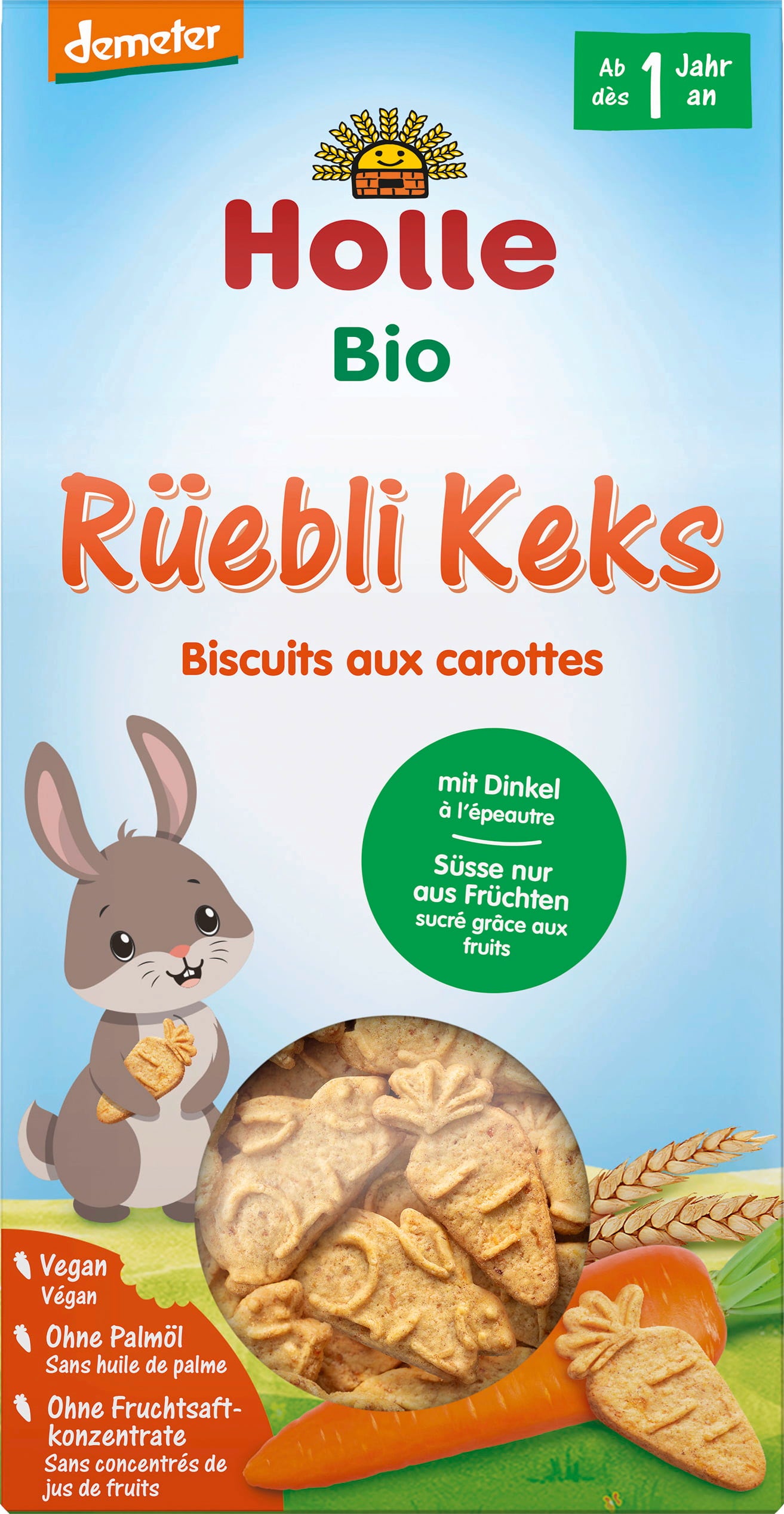 Die Rübli Kekse aus feinem Dinkelmehl, saftigen Karotten und der Süße aus Datteln und Aprikosen sind der ideale Snack für zwischendurch. Kinder ab einem Jahr erfreuen sich an einem leckeren Keks, der vegan, ohne Palmöl und rein mit der Süße aus Früchten konzipiert wurde.