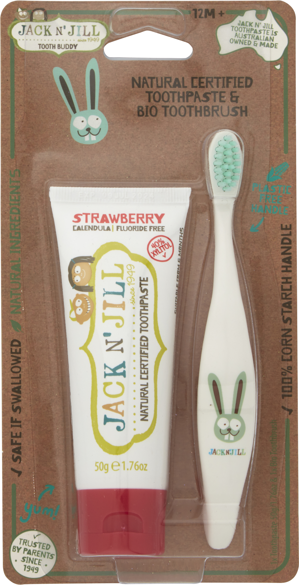 Die im Tooth Buddy Set enthaltene Zahnbürste von Jack N'Jill ist für Kinder ab einem Alter von 12 Monaten geeignet. Die natürliche Zahncreme mit Erdbeergeschmack gestaltet das Putzen einfach und ist auch beim Verschlucken absolut sicher. Das lustige Design bereitet Freude und weckt das Interesse der Kinder.