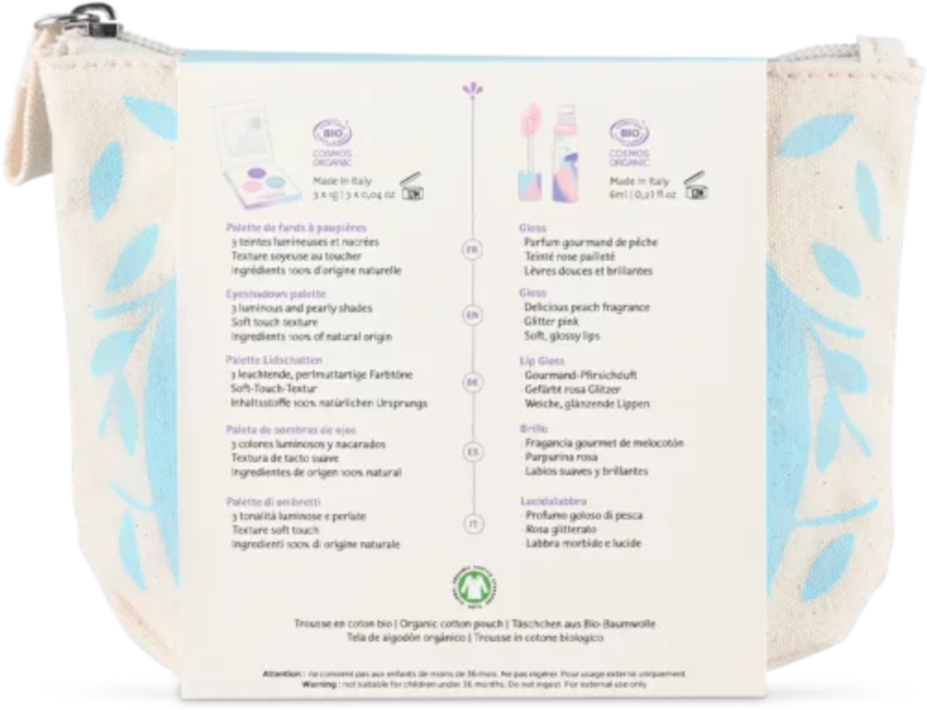 In dieser hübschen Tasche ist alles drin, was das Kinderherz zum Schminken begehrt: drei Lidschatten in strahlenden sowie schimmernden Nuancen und ein glitzernder Lipgloss mit Pfirsichduft. Alle Produkte sind sanft zu Kinderhaut, hypoallergen und einfach abzuwaschen. Das macht das Set zum perfekten Geschenk.