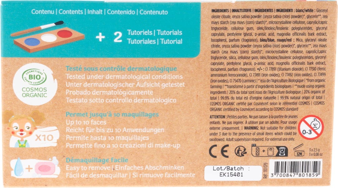 Mit den drei Farben in Blau, Weiß sowie Rot und dem Pinsel lassen sich Clown oder Harlekin-Make-ups realisieren. Für hautfreundliche und unbedenkliche Stunden voller Spielfreude.