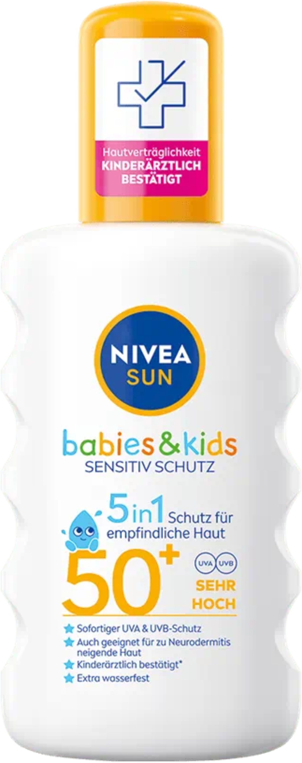 Eltern kennen das Problem: Wenn unsere kleinen Lieblinge sich schon ins Abenteuer (oder ins kühle Nass) stürzen wollen, haben weder Eltern noch Kind Lust auf eine langwierige Eincreme-Prozedur. Trotzdem ist gerade bei Kindern Sonnenschutz Pflicht! Der parfümfreie SUN Babies & Kids Sensitiv Schutz Sonnenspray lässt sich daher ganz einfach aufsprühen und verteilen. Der leichte Spray zieht sofort und ohne klebrige Rückstände ein. Die extra wasserfeste Formel bietet sofortigen Schutz vor sonnenbedingten Hautschäden mit LSF 50+ und UVA-/UVB-Filter. Also: aufsprühen - verteilen - und los geht's!