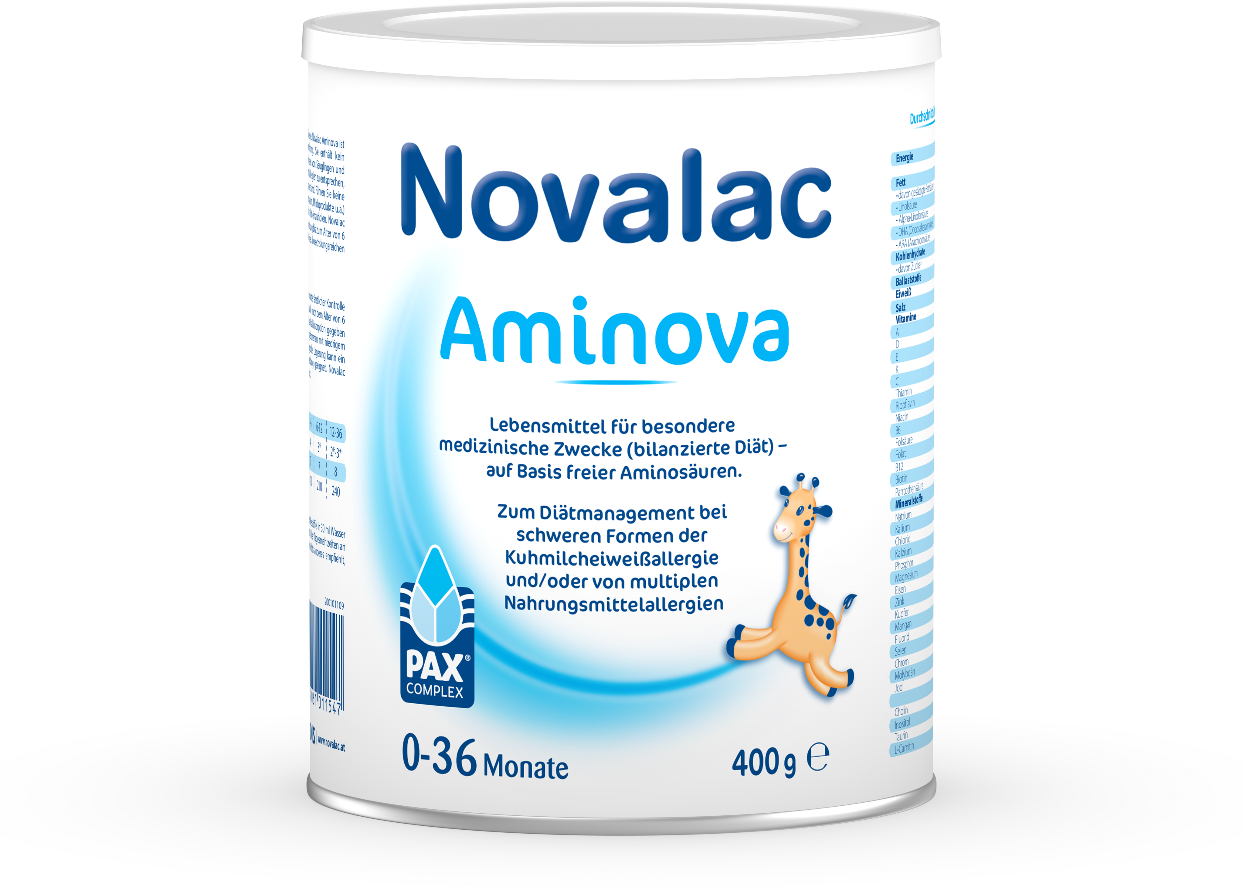 Novalac Aminova dient als Nahrung für Babys und Kinder mit Kuhmilchallergie oder multiplen Nahrungsmittelallergien. Ideal geeignet ist die Nahrung für Babys und Kinder von 0 - 36 Monaten, wobei bis zum 6. Monat Novalac Aminova auch als alleinige Nahrung verwendet werden kann. Novalac Aminova ist mit freien Aminosäuren (an die Muttermilch angepasstes Aminosäuren-Profil) sowie mit LCP (DHA + ARA), wichtigen Vitaminen, Mineralstoffen und einem innovativen Verdickungsmittel angereichert.