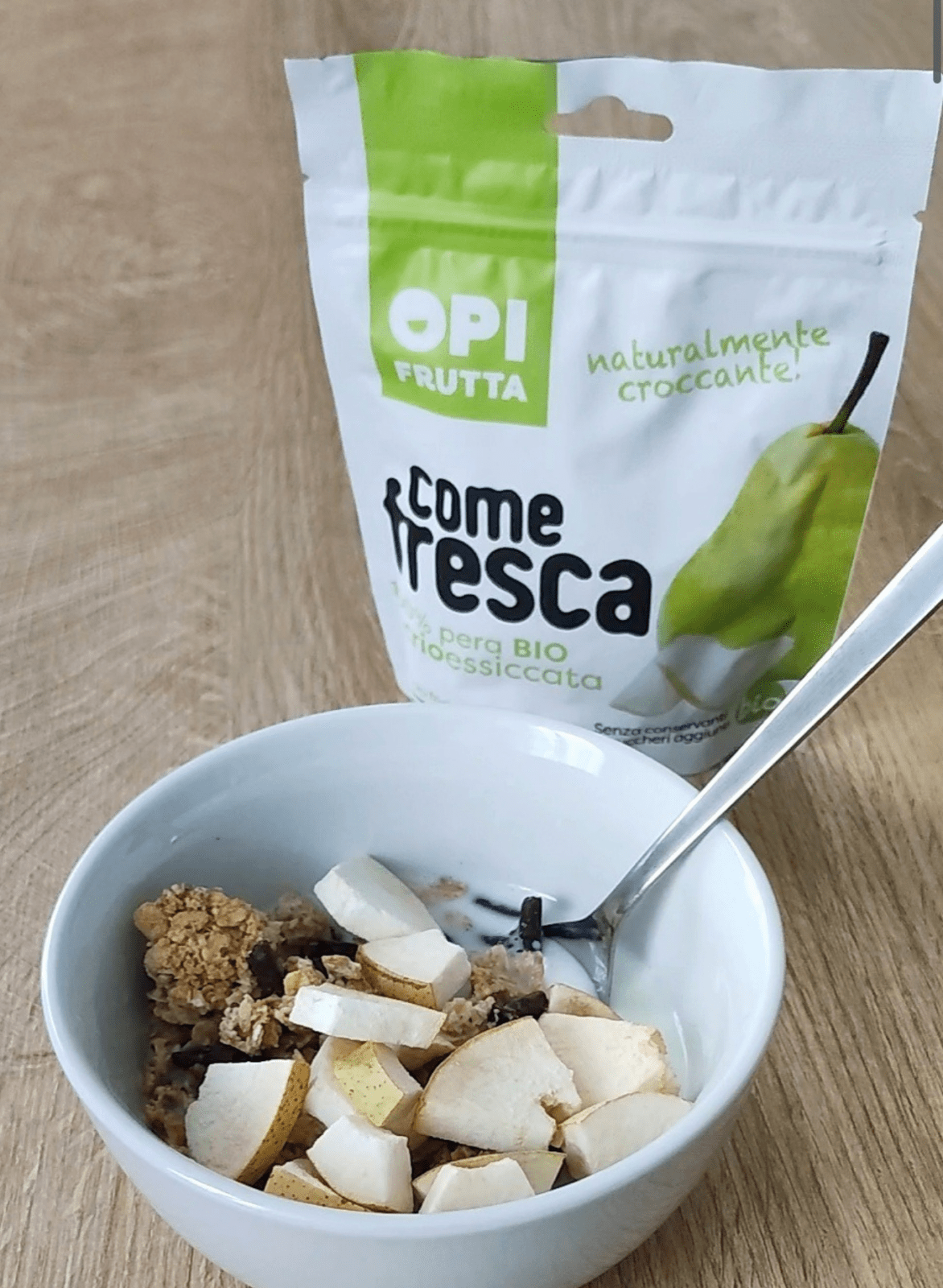 Diese gefriergetrockneten Bio-Birnen stammen aus der Region Modena. Sie punkten mit zarter Textur, natürlicher Süße und einem hohen Ballaststoffgehalt – ideal für bewusste Ernährung bei vollem Geschmack.