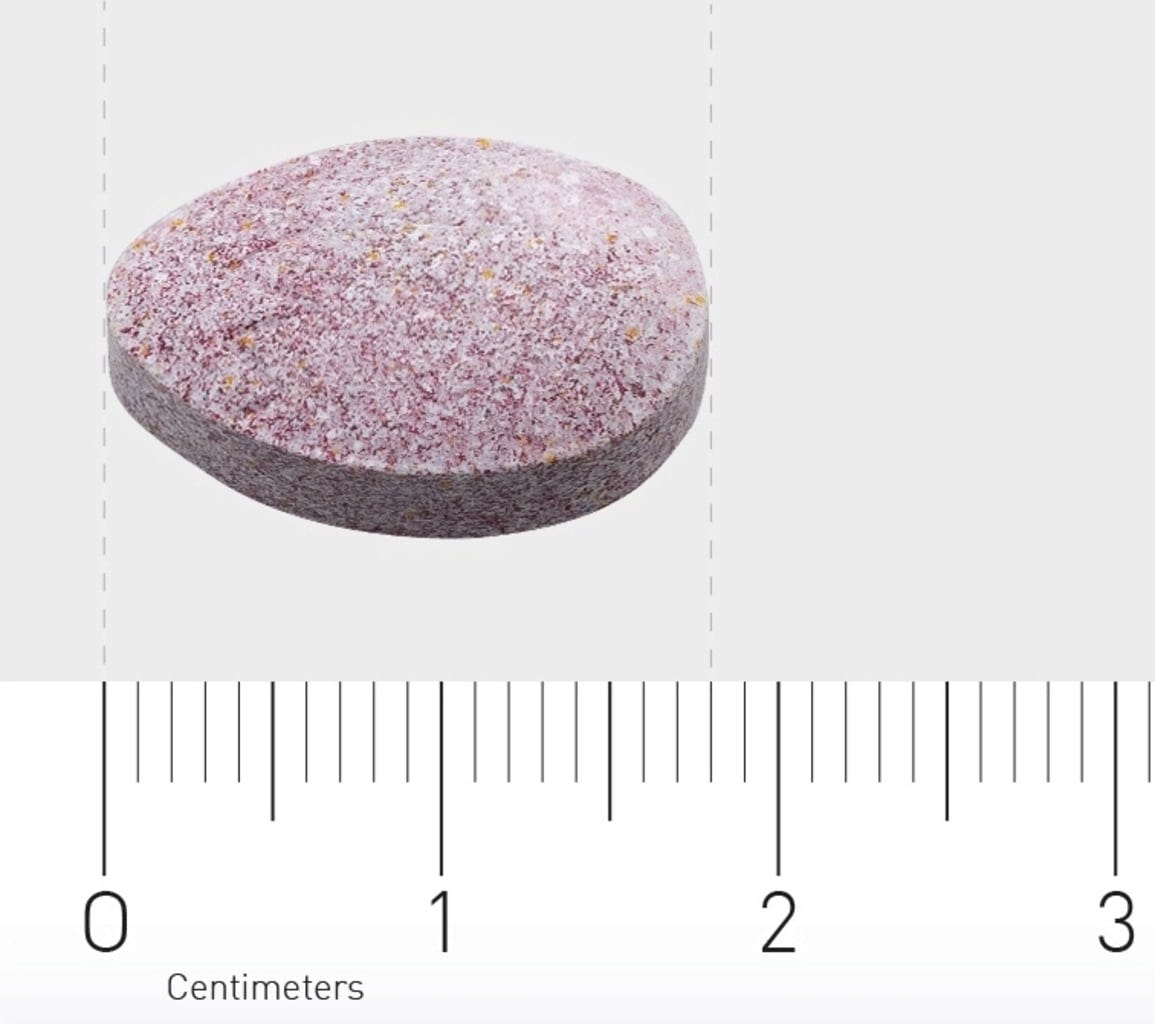 Calcium (Calciumcarbonat, Calciumcitrat), Süßungsmittel (Dextrose), Magnesium (Magnesiumcarbonat, Magnesiumcitrat), L-Ascorbinsäure, Zinkcitrat, Farbstoff (Rote Bete Pulver), Süßungsmittel (Xylit), Trennmittel (Speisefettsäuren, Siliciumdioxid, Magnesiumsalze von Speisefettsäuren), Geschmacksstoffe (Himbeeraroma), Niacinamid, Vitamin B5 (Calciumpantothenat), Säuerungsmittel (Citronensäure), Vitamin E (d-alpha-Tocopherol), Eisenfumarat, Cholinbitartrat, Mangansulfat, Riboflavin, Thiaminmononitrat, Pyridoxal-5-Phosphat, Kupfergluconat, Inositol, Vitamin A (Retinylacetat), Folsäure, Natriumselenat (Selen) (Natriumselenit, L-Selenomethionin), Kaliumjodid, Natriummolybdat, Biotin, Vitamin D3 (Cholecalciferol), Chrompicolinat, Cyanocobalamin