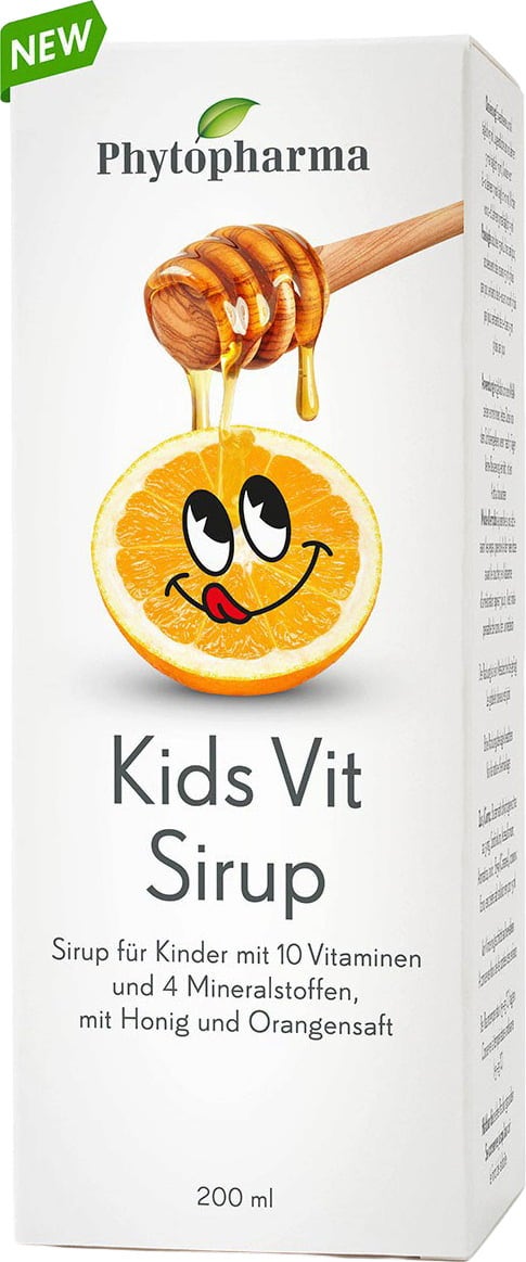 Der Kids Vit Sirup von Phytopharma schmeckt nach fruchtigen Orangen und kann verdünnt oder unverdünnt getrunken werden. Seine vegetarische Rezeptur ist mit 10 Vitaminen, 4 Mineralstoffen und Honig angereichert.