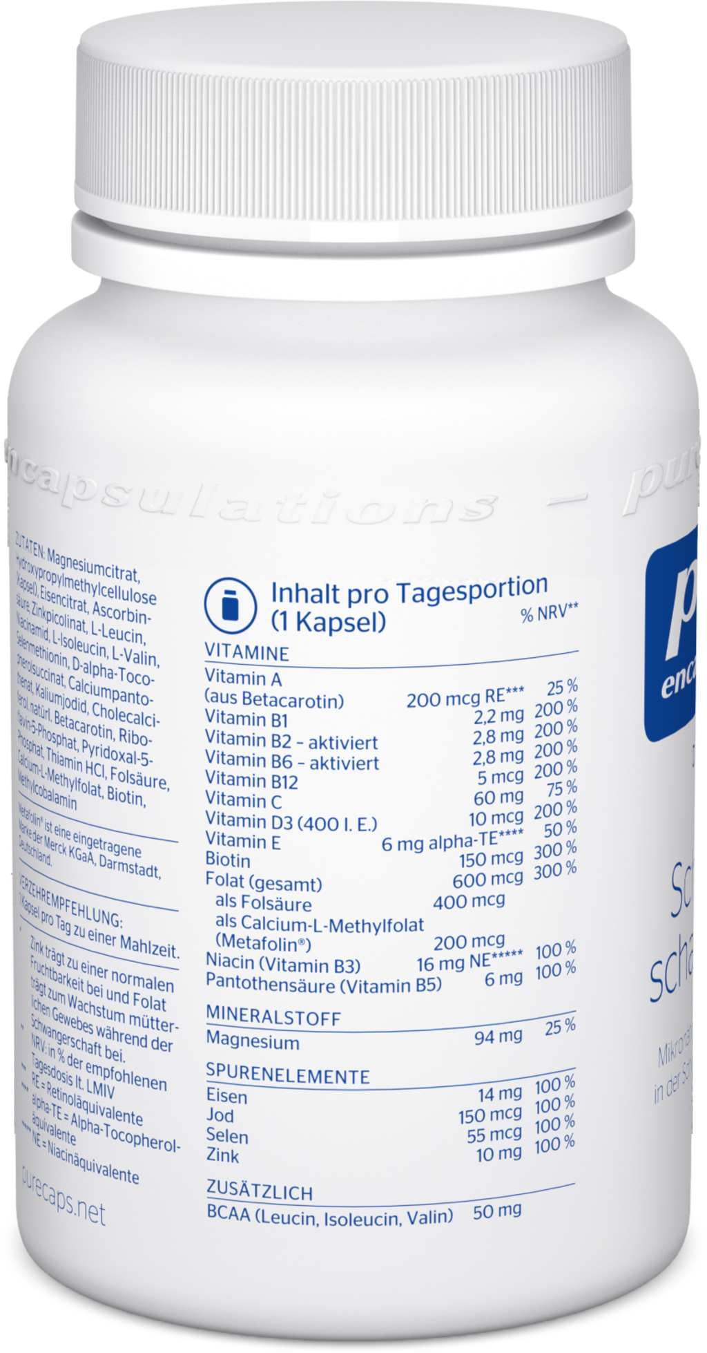 Diese Schwangerschafts-Formel ist ein abgestimmtes Produkt aus Vitalstoffen. Neben wichtigen Vitaminen enthält die Formel Magnesium, Jod, Eisen, Selen und Zink sowie die BCAAs Leucin, Isoleucin und Valin.