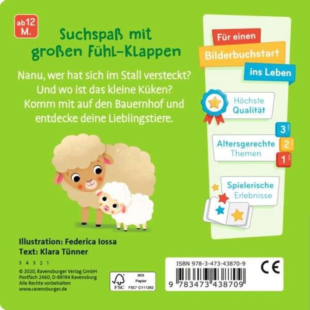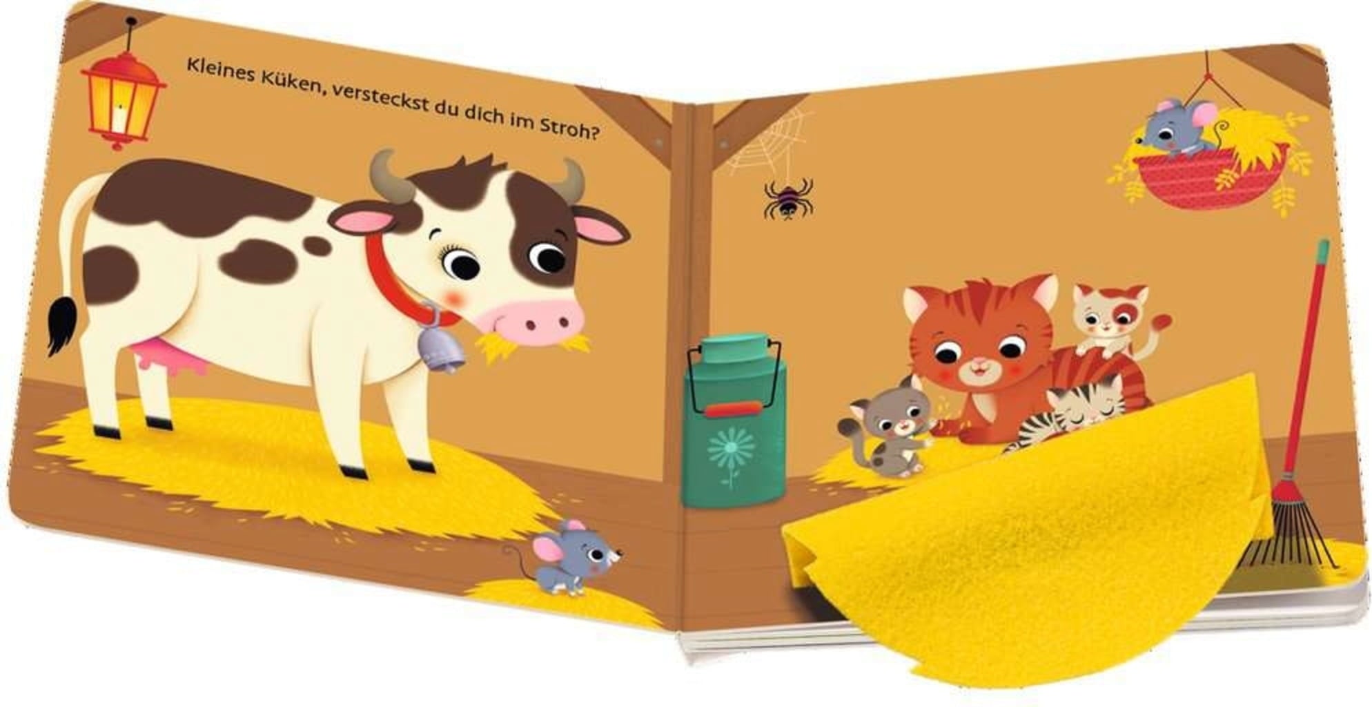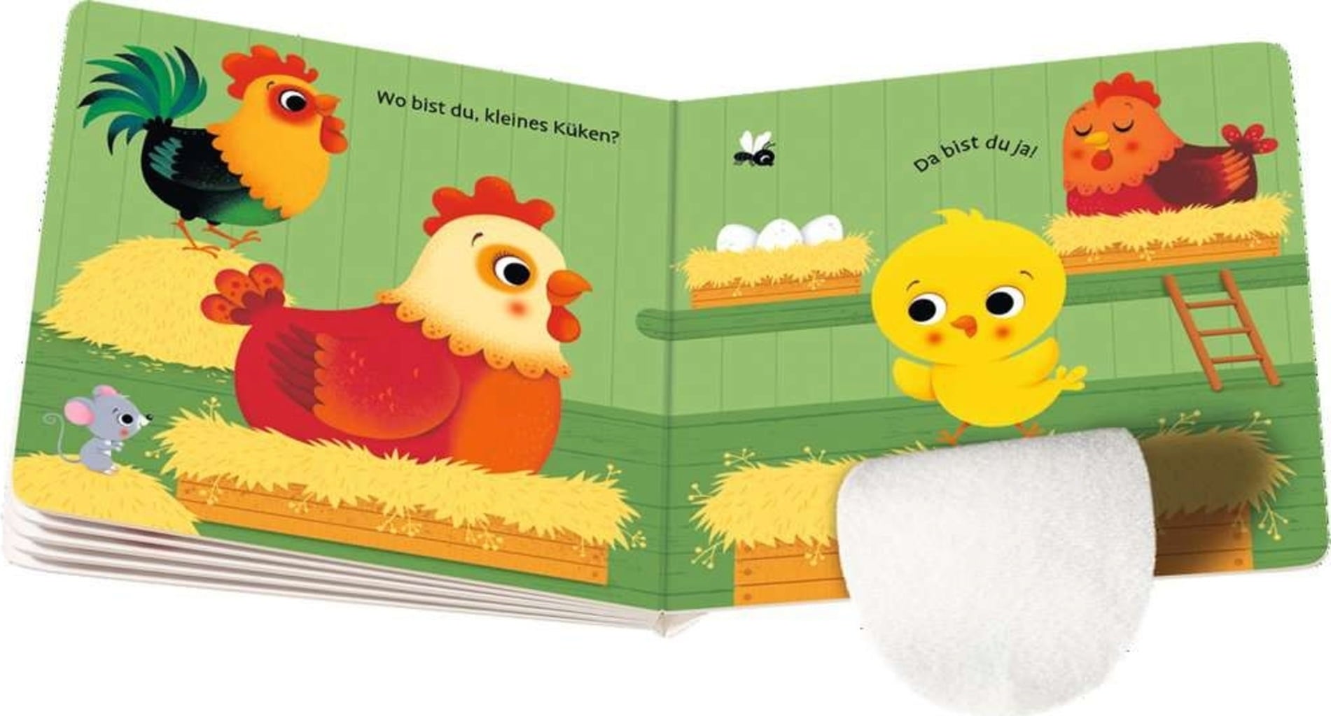 Wo hat sich bloß das kleine Küken versteckt? Vielleicht spielt es mit dem Ferkelchen im Matsch? Oder hat es sich doch zum Schlafen in die Hundehütte gelegt? Erst durch das Öffnen der Stoffklappen erhalten Kinder ab 12 Monaten Hinweise dazu, wo das Küken verblieben ist.