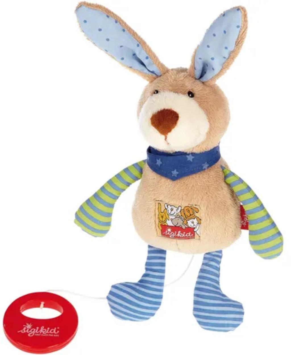 Wer würde nicht gerne mit diesem süßen Hasen kuscheln? Zieht man an der Schnur, spielt er eine sanfte Melodie und begleitet damit beim Schlafengehen.