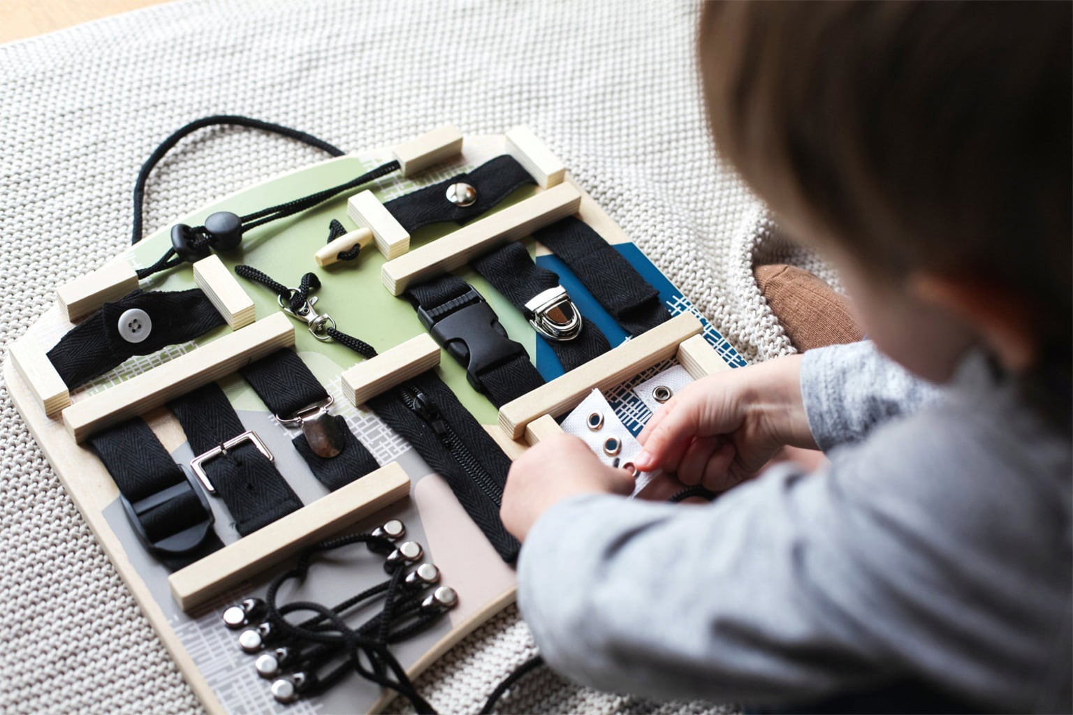 Ein Motorikbrett voller Verschlüsse, mit denen Kinder tagtäglich zu tun haben. Hier kann man in Ruhe probieren und erforschen, während sich ganz nebenbei feinmotorische Fähigkeiten sowie Hand-Augen-Koordination verbessern. Die ergonomische Form erlaubt ein bequemes Spielen im Sitzen und Liegen.