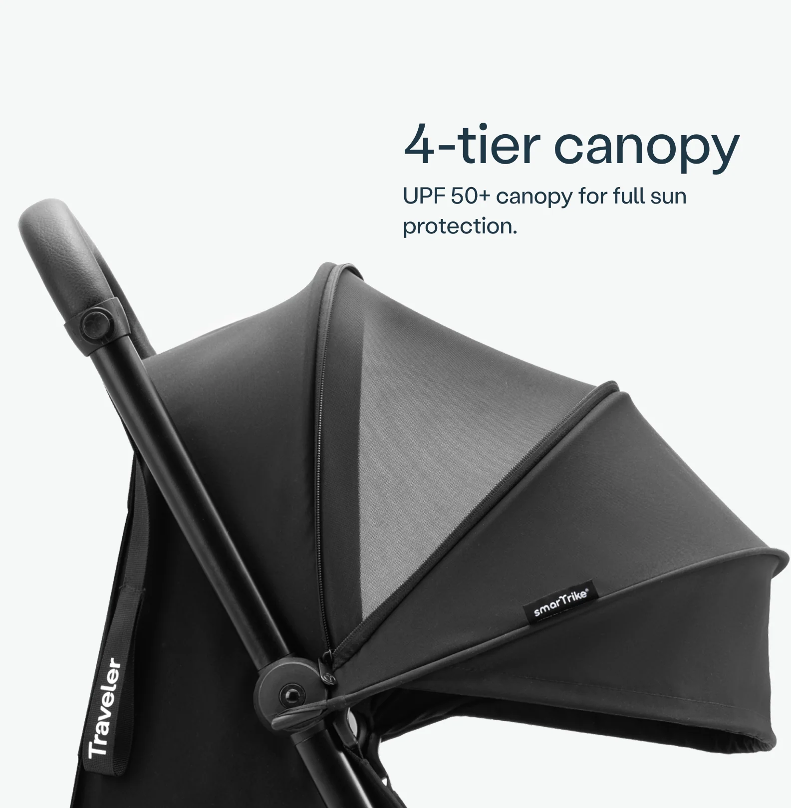 Besonders für aktive Eltern ist der Traveler ein echter Gamechanger: Er lässt sich mit nur wenigen Handgriffen so kompakt zusammenfalten, dass er problemlos in die meisten Flugzeug-Handgepäckfächer passt. Die verstellbare Rückenlehne sorgt dafür, dass dein Schatz auch unterwegs entspannt schlummern kann, während du von der sanften Lenkung profitierst.