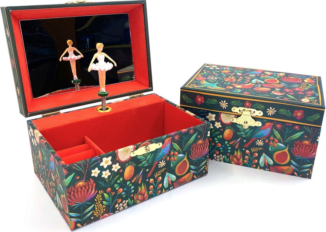 Diese entzückende Schmuckschatulle mit Musik bietet viel Platz für kostbare Schätze. Einfach aufziehen und öffnen. Mit den ersten Klängen vom Tanz der Zuckerfee aus Tschaikowskis weltberühmtem Ballet Der Nussknacker beginnt sich die grazile Ballerina zu drehen. Die Schatulle beinhaltet einen Spiegel und einen Ringhalter.