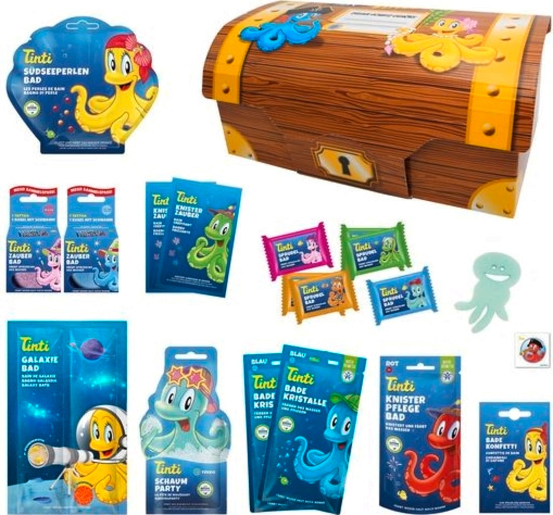 Mit der Pflegespaß Schatztruhe von TINTI wird jedes Bad ein echtes Erlebnis. Luftiger Schaum, knisternde Badekristalle, Konfetti-Figuren aus Seife, bunte Badefarben und mehr erwarten dich. Mische die verschiedenen Produkte, um den Spaß noch weiter zu erhöhen.