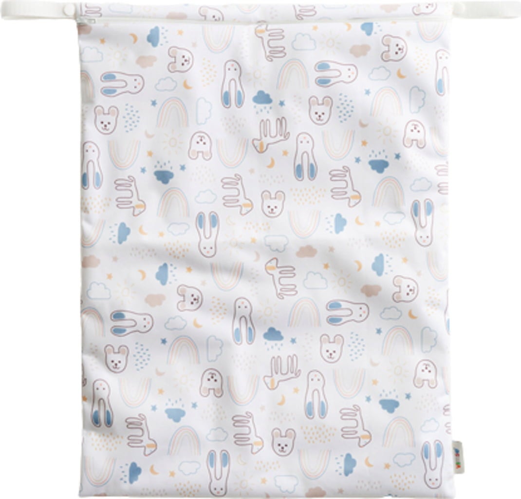 Die große Wet Bag ist für den Transport von gebrauchten Stoffwindeln oder anderen feuchten Textilien. Sie ist mit einem Kordelzug ausgestattet und kann mit einer Lasche mittels Druckknopf am Kinderwagen befestigt werden.