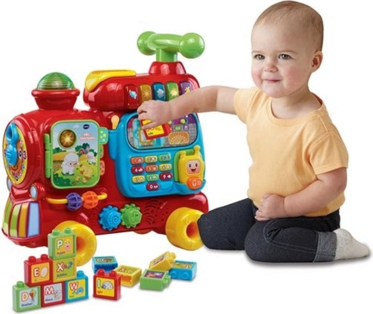 Achtung, die ABC-Eisenbahn fährt ein. Entdecke Zahlen, Buchstaben, Farben, Tiere und mehr. Höre dir lustige Lieder an und singe selbst mit. Staple die Buchstabenklötze so hoch du kannst. Nimm wichtige Anrufe mit dem Spielzeug-Walkie-Talkie entgegen. Befördere dein Lieblingsspielzeug von A nach B. Ein farbenfrohes Set, das schier unendlich lange Unterhaltung bietet.