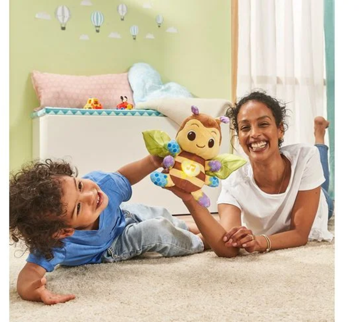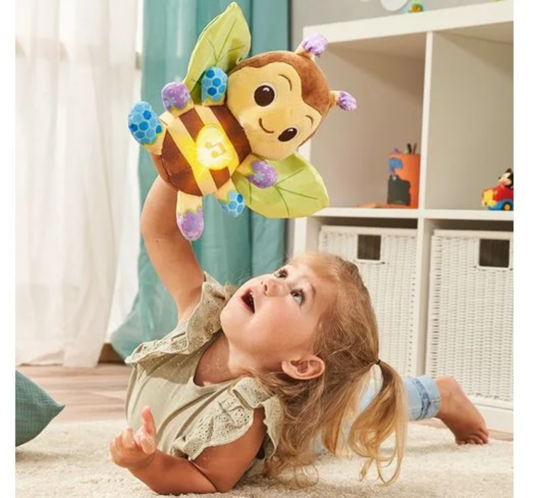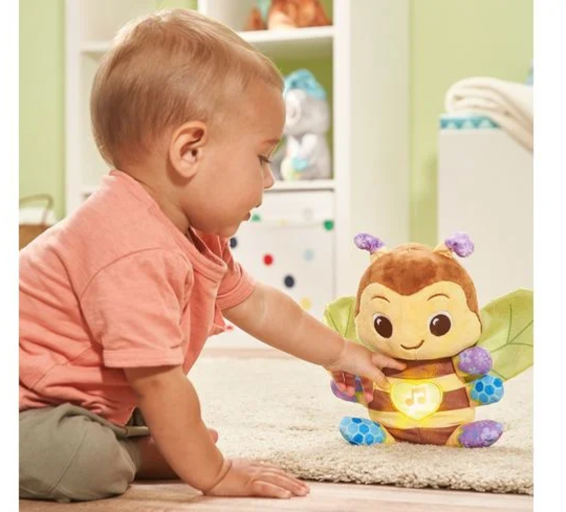 Mit dieser lustigen Musik-Kuschelbiene ist immer wieder für Unterhaltung gesorgt. Mit ihren lustigen Geräuschen, Musik und liebevollen Sätzen zaubert sie den Kleinsten immer wieder ein Lächeln ins Gesicht. Auch das Kuscheln und Spielen kommt nicht zu kurz mit der kleinen Biene. Lass das Tierchen flattern, indem du die Hände von hinten in ihre Flügel steckst und staune, wie sie fröhlich durch den Raum summt. Hier ist abwechslungsreicher Spielspaß vorprogrammiert!