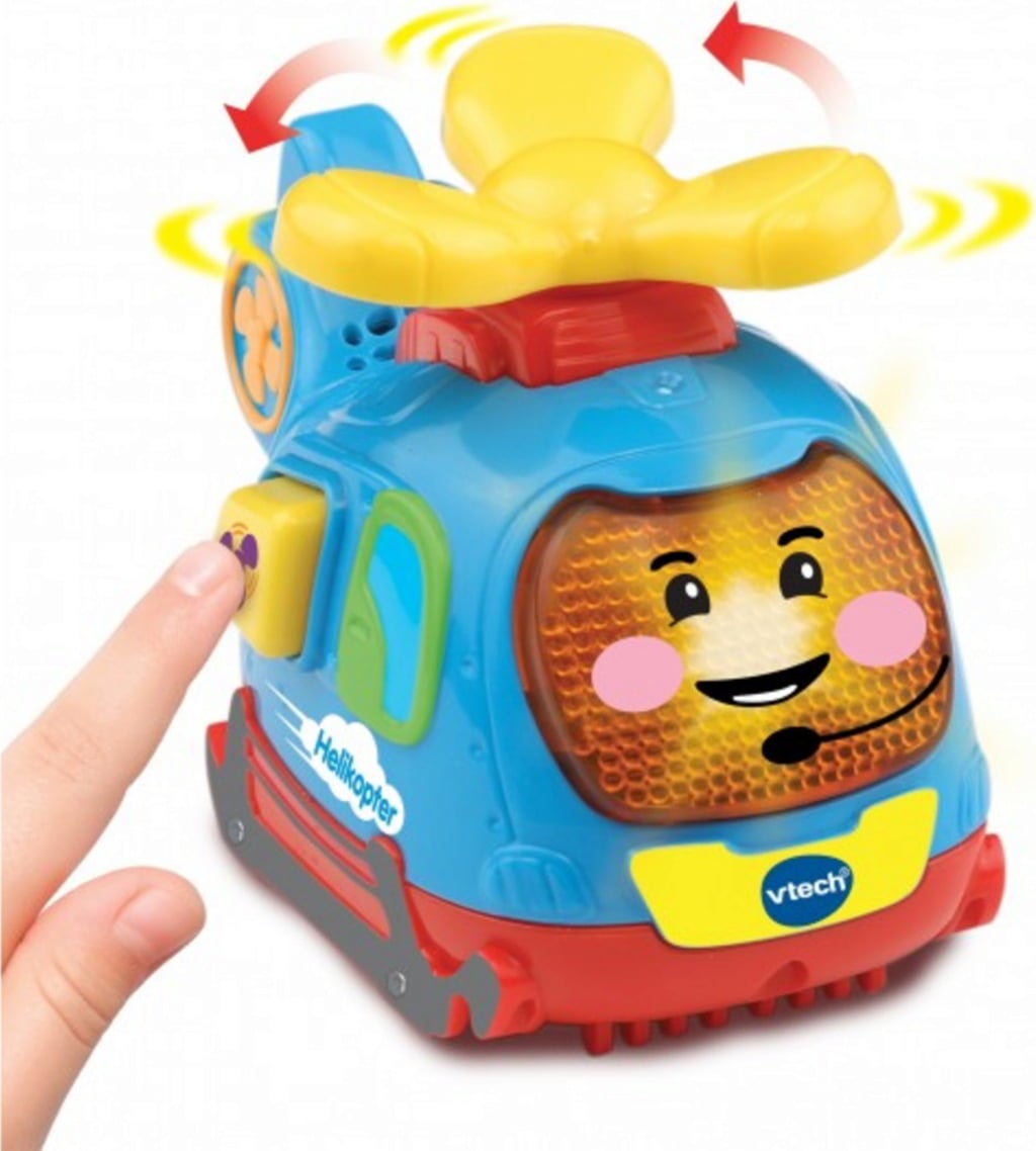 Dieser fröhliche Helikopter verbreitet garantiert gute Stimmung, wenn er durch das Kinderzimmer saust. Dabei reagieren seine Räder auf die Bewegungen und lassen unterhaltsame Sätze und Geräusche erklingen. Die Rotorblätter werden per Knopfdruck bewegt und die Leuchttaste an der Vorderseite ermöglicht zusätzlich musikalische Erlebnisse mit Lieder und Melodien.
