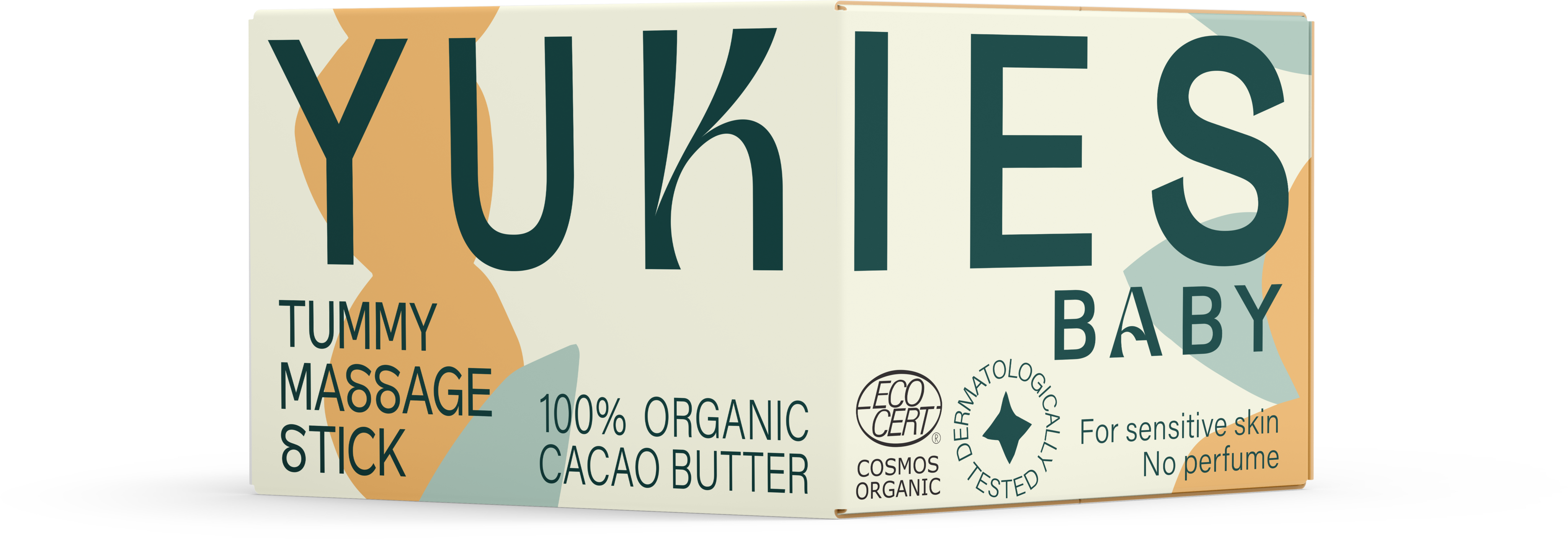 Der Tummy Massage Stick von Yukies besteht aus 100 % reiner biologischer Kakaobutter. Somit eignet er sich für alle Hauttypen und speziell für sensible Babyhaut.